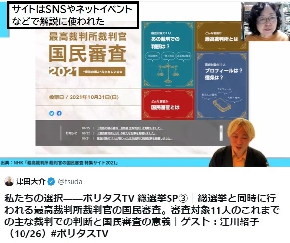 评审认为,大多民众都认为日本最高法院国民审查投票是有较高重要性的,但事实上没有太多的个人参与,而造成这一现状的原因主要在于信息的“隔阂”。此网站的出现给予了民众一个便捷的渠道以高效地获取这些信息,参与国民审查投票是公民的重要权利,也是一次重要的可参与改善社会的机会。该网站被评价为是借助大众传媒的、恰到好处的绝妙设计。