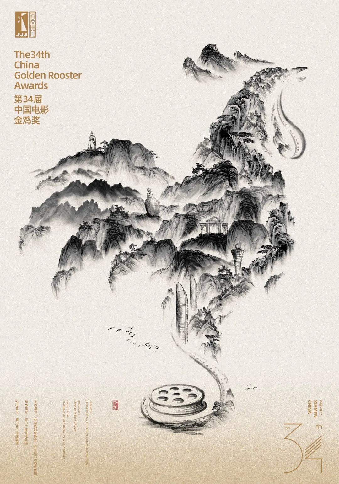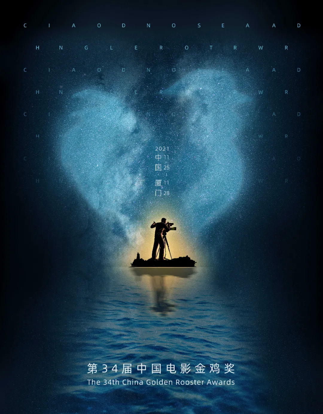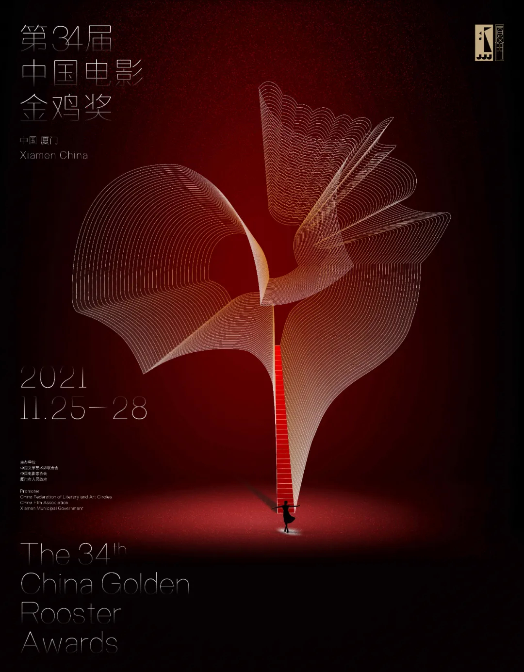 【评】以波光粼粼的海面和艺术唯美的涟漪纹理为主体,体现厦门滨海城市的特色,海面的波光组成金鸡奖奖杯的轮廓,美轮美奂。