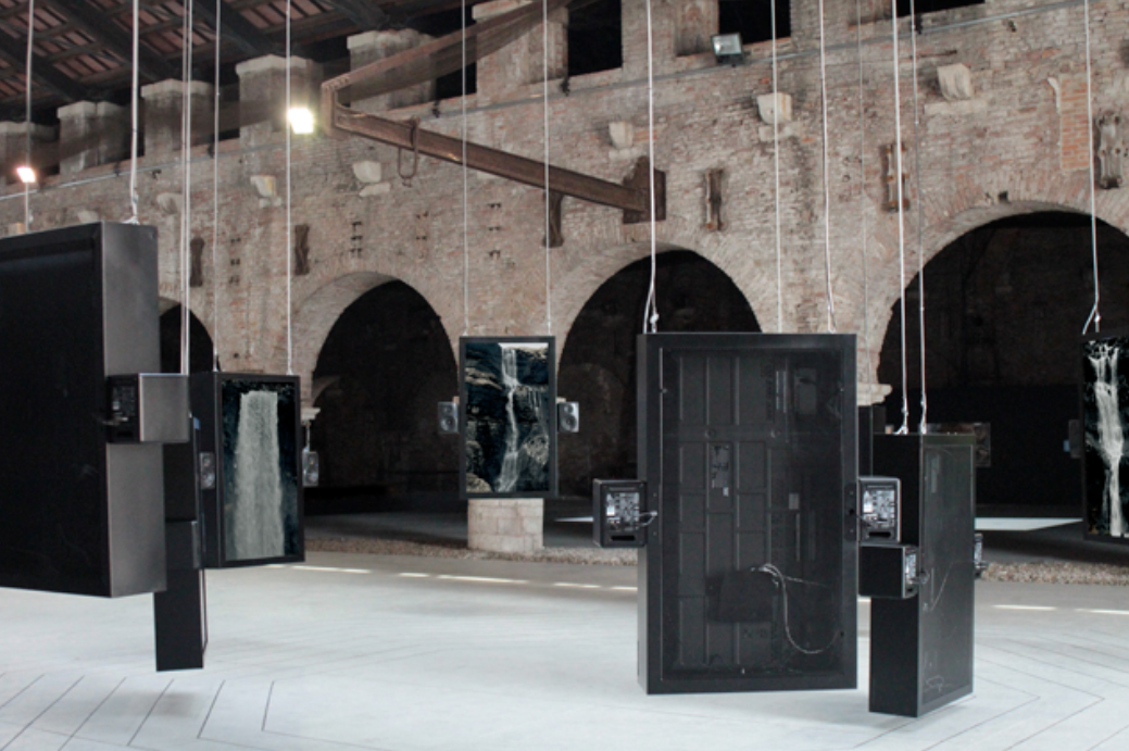 该作品由八个悬挂的面板组成,多块屏幕在空间中的错落摆放让观众形成了全方位的立体感受。每个面板上都播放着从悬崖流下来的瀑布视频,并伴随着水流过岩石的轻快声音,让观众有一种身临其境的沉浸式体验。