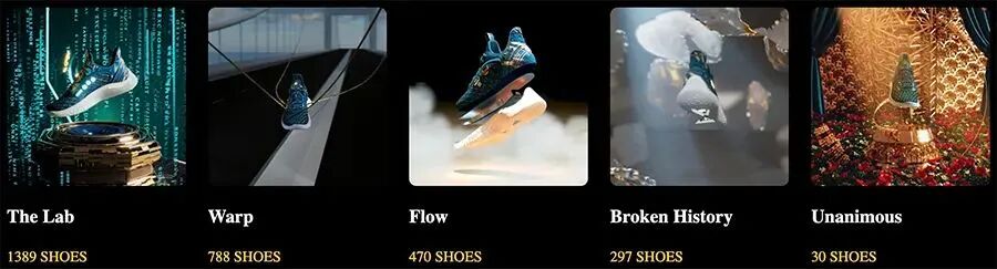 随着库里登顶 NBA 历史3分榜,Under Armour 旗下 Curry Brand 带来了一个特殊的 NFT 系列。“Genesis Curry Flow”系列以库里破纪录时所穿着的 Curry Flow 9 为原型,打造了 5 款不同主题的虚拟球鞋,每款都是限量的,数量从 1389 到 30 枚不等,总数 2974 枚。