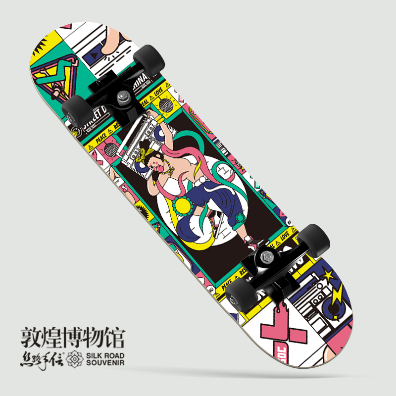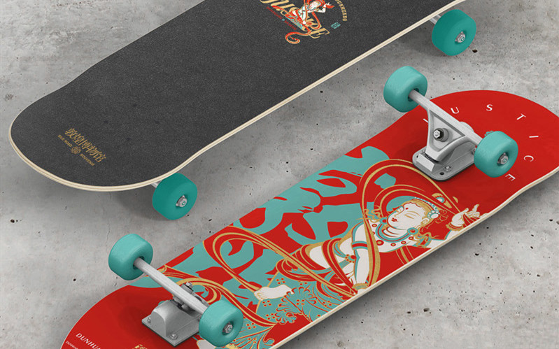 以下两款私人定制的滑板,由敦煌壁画与极限运动结合设计而成,不仅让传统文化玩出了新花样,也掀起了一股敦煌文化消费的热潮。这两块定制滑板,一块青色为底、一块红色为底,最亮眼的是板面上的飞天。两个飞天造型为:胡旋舞和反弹琵琶,都是有古代壁画与之对应。