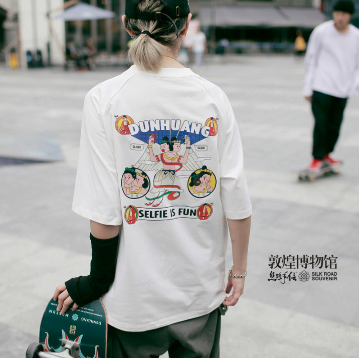 譬如这件再创敦煌系列中的T恤,就融合了古典艺术与街头风格。秉承着“青年要酷,菩萨要潮”的设计理念,T恤的正面比较简约,只有胸前一个仙女logo,背面是挥舞着翅膀的妙音仙女,结合“selfie is fun”的街头文化slogan,将传统与现代融合得恰到好处。