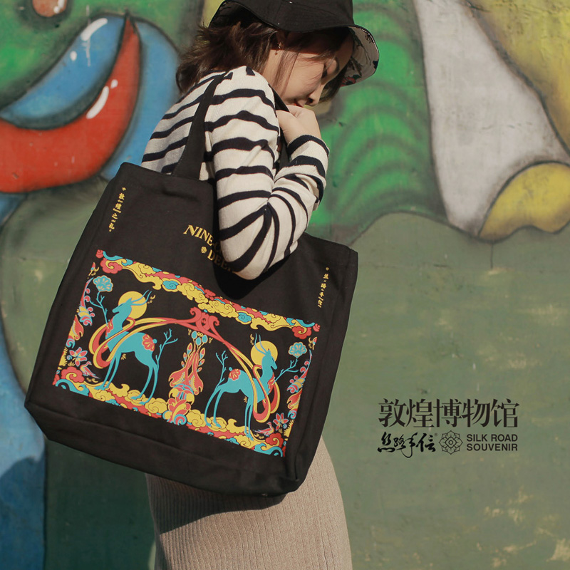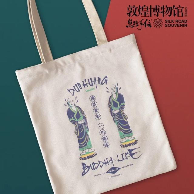 这款帆布包走的是“佛系时尚,不同寻常”的路线,搭配“佛系青年,一切随缘”的文字,结合敦煌艺术中佛像彩塑的基本形态,用符合年轻气质的插画风格进行创作,使佛的形象更接近这个时代的精神理想。