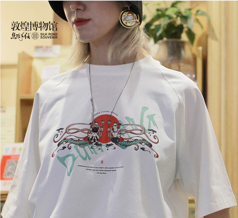 这个系列的T恤理念是“身披飞天,漫游人间”,乍一看图案上面的飞天仙女,弹奏着乐器,自由自在,悠然自得,俨然一副漫游人间的模样。
