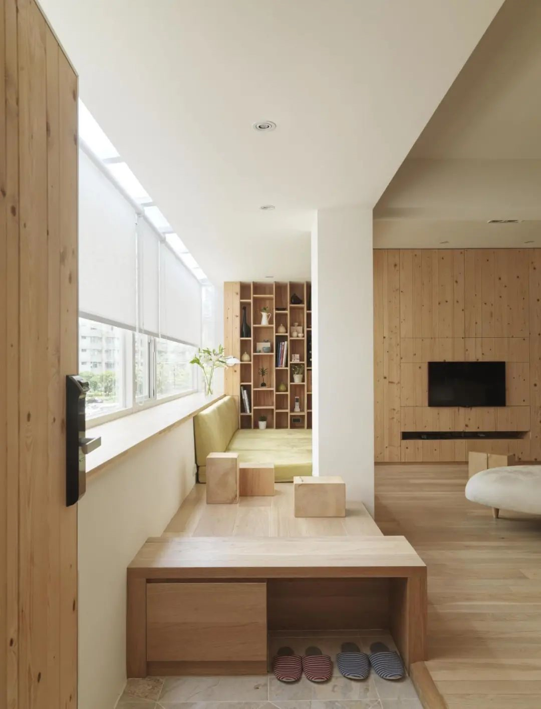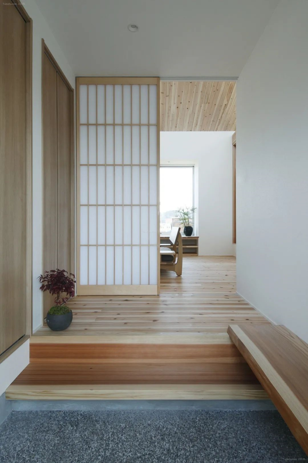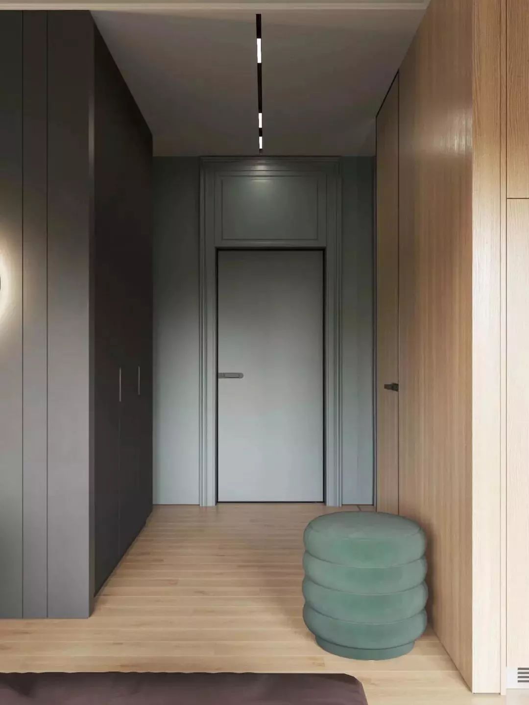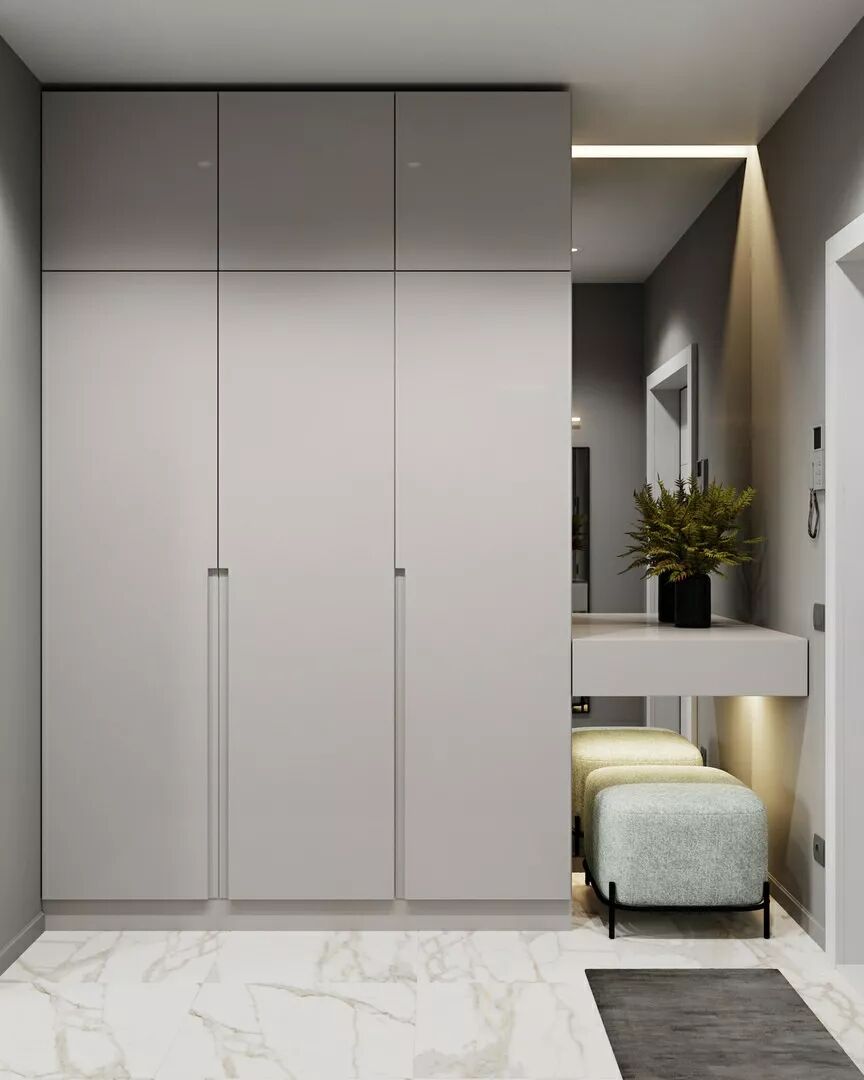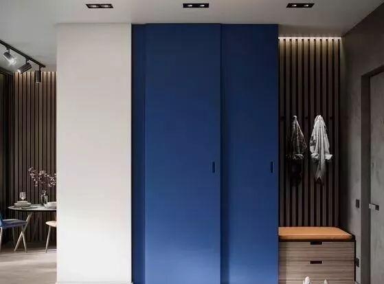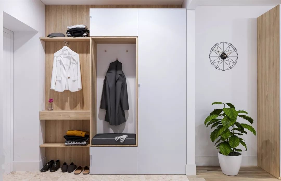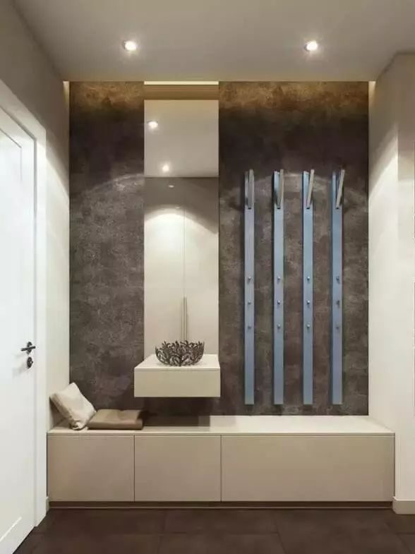 走廊式门厅 如果家里一进去就是一个狭长的走廊,你也千万别浪费了。 只要面积允许,不妨将垂直空间拿来做成一个嵌入式的立柜,结合鞋柜、换鞋凳和挂放区,促成一个新的功能区的诞生,效果不要太赞!