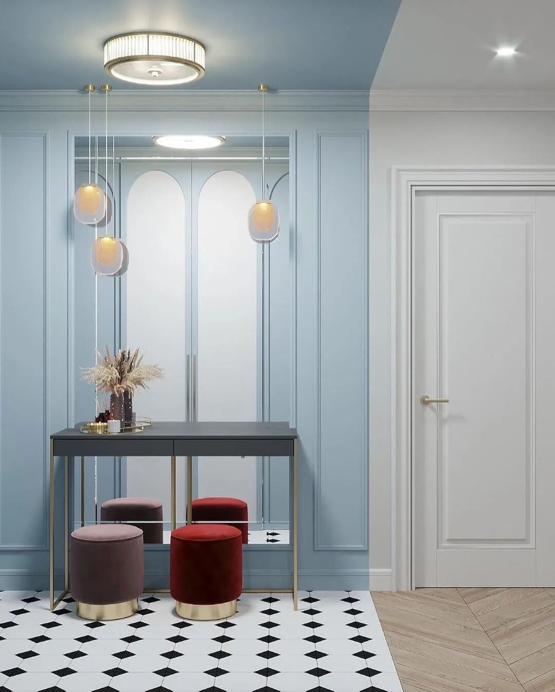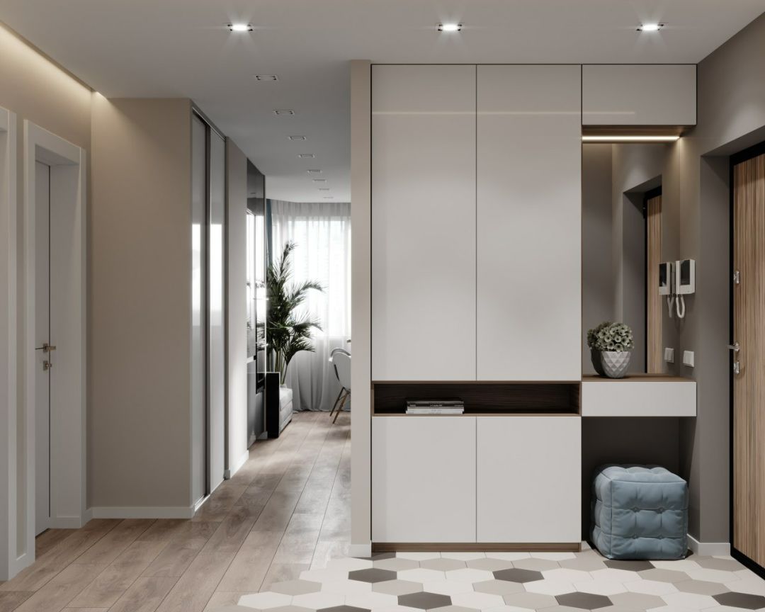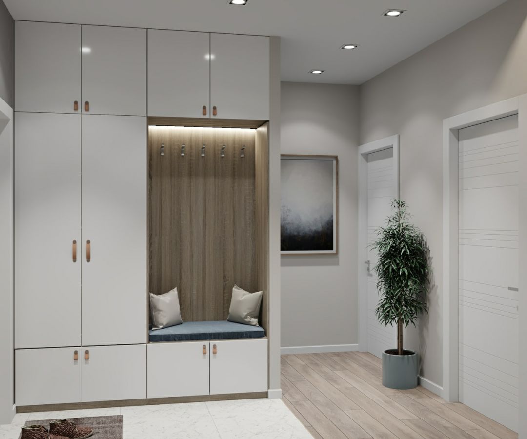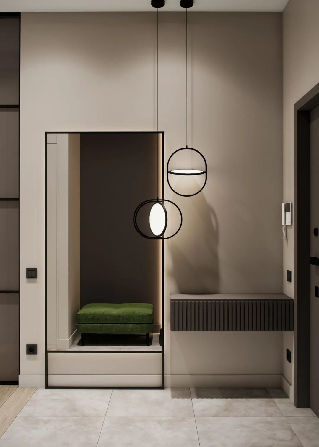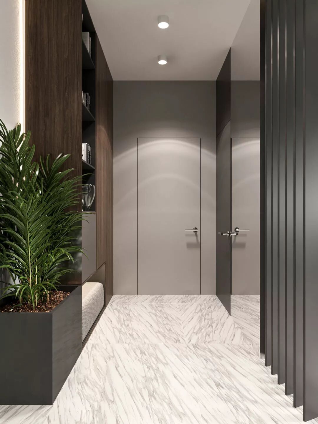 走廊式门厅 如果家里一进去就是一个狭长的走廊,你也千万别浪费了。 只要面积允许,不妨将垂直空间拿来做成一个嵌入式的立柜,结合鞋柜、换鞋凳和挂放区,促成一个新的功能区的诞生,效果不要太赞!
