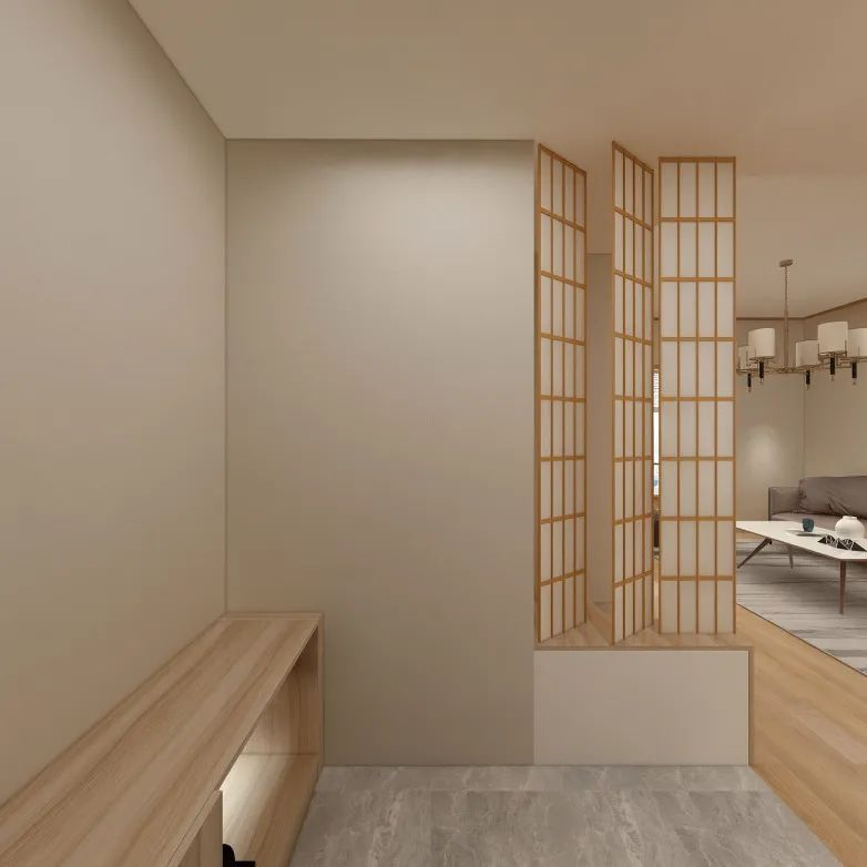 下沉式玄关又名落尘区,即在装修中,制造室内地面与玄关区域的高低差,来增强视觉上的空间凹凸感,营造更有深度的空间层次感。