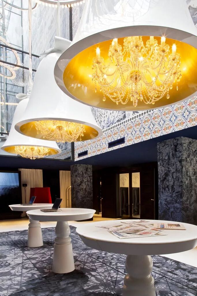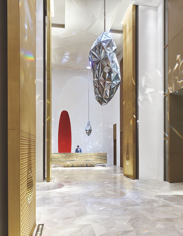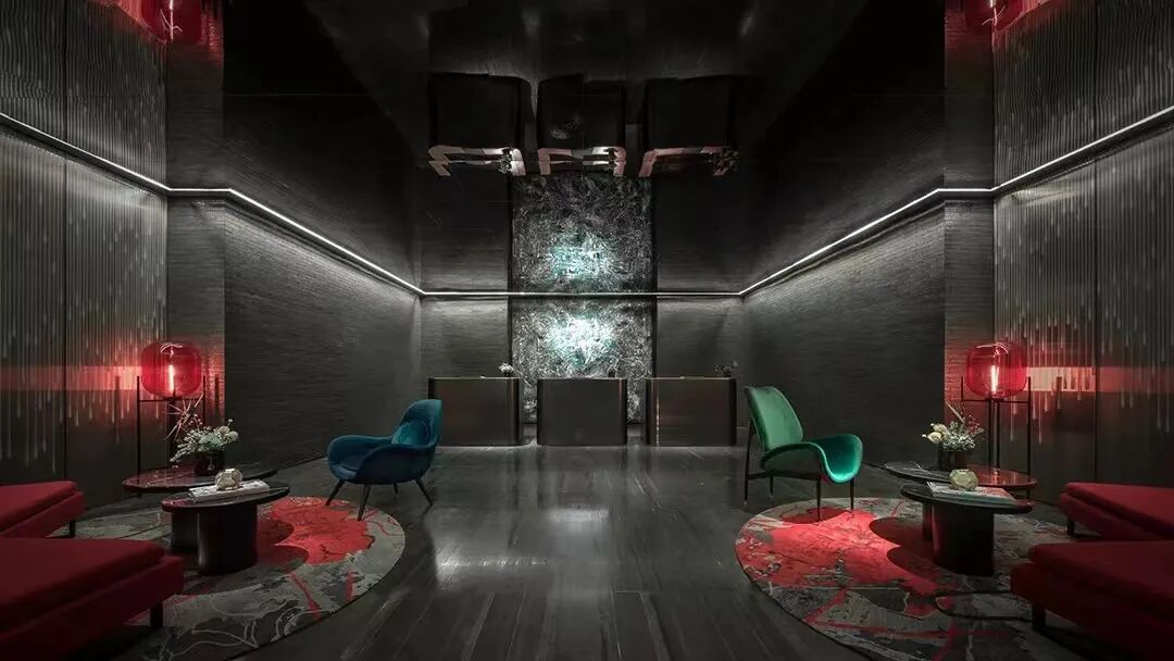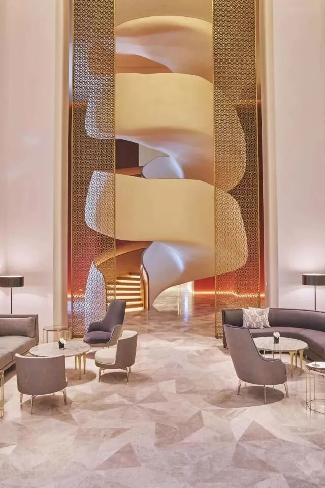 从酒店楼顶延伸下来的金属装饰吊顶,在灯光的照耀下闪着彩虹般的色彩,洒落在大堂的每一个角落,大堂的纹理石灰石墙壁延伸至近9米高的天花板。金黄色的固装家具与灰色空间搭配,形成鲜明对比,犹如现实与幻想的花园,让人不由得惊叹。