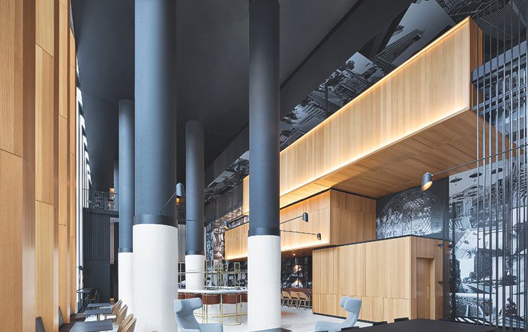 这是一家以工业风为基调的酒店,黑白黄是酒店使用最多的颜色,经典坚硬与柔软并存的创意指引了客人在此停留或休闲的和一杯咖啡,体会这舒适的感觉。