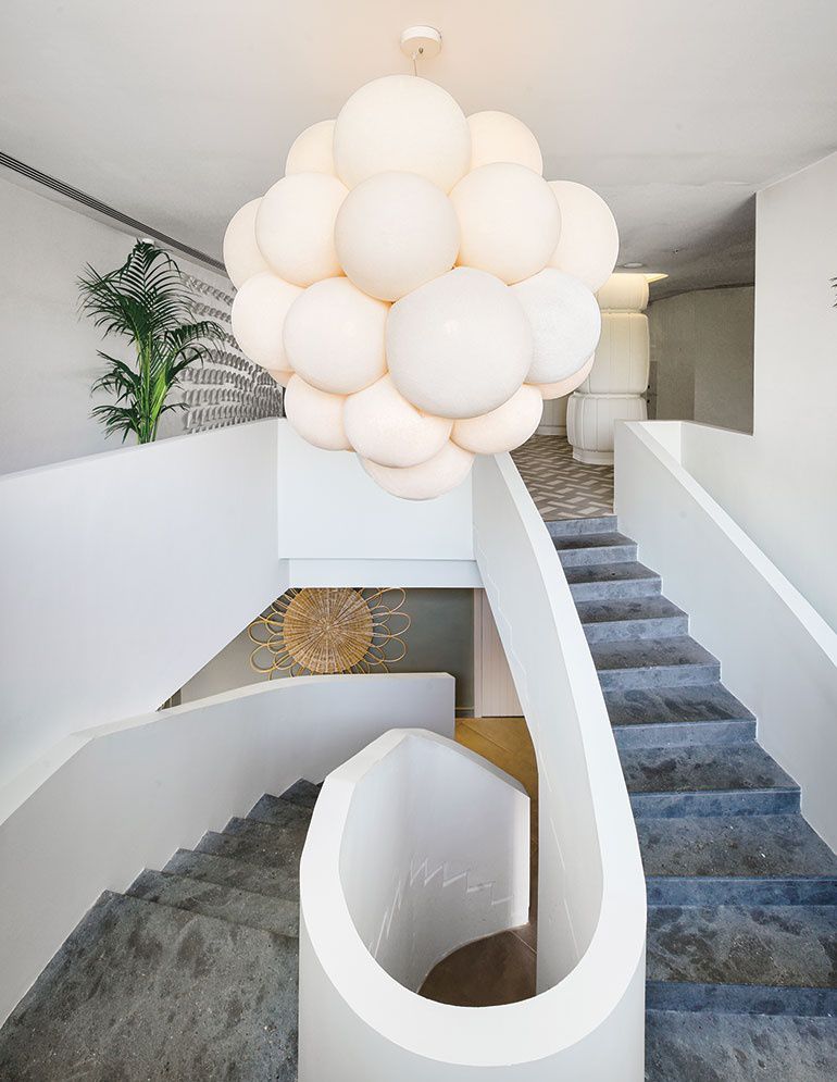 酒店的整体氛围是轻松和沙滩,在顶部,有聚酯材料制作的吊灯,让空间别具一格,里面的白色、蓝色、绿色、淡黄色几种颜色混合,犹如置身于蓝天白云、沙滩、椰树椰果。让人充满想象。
