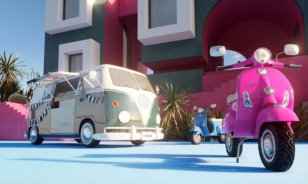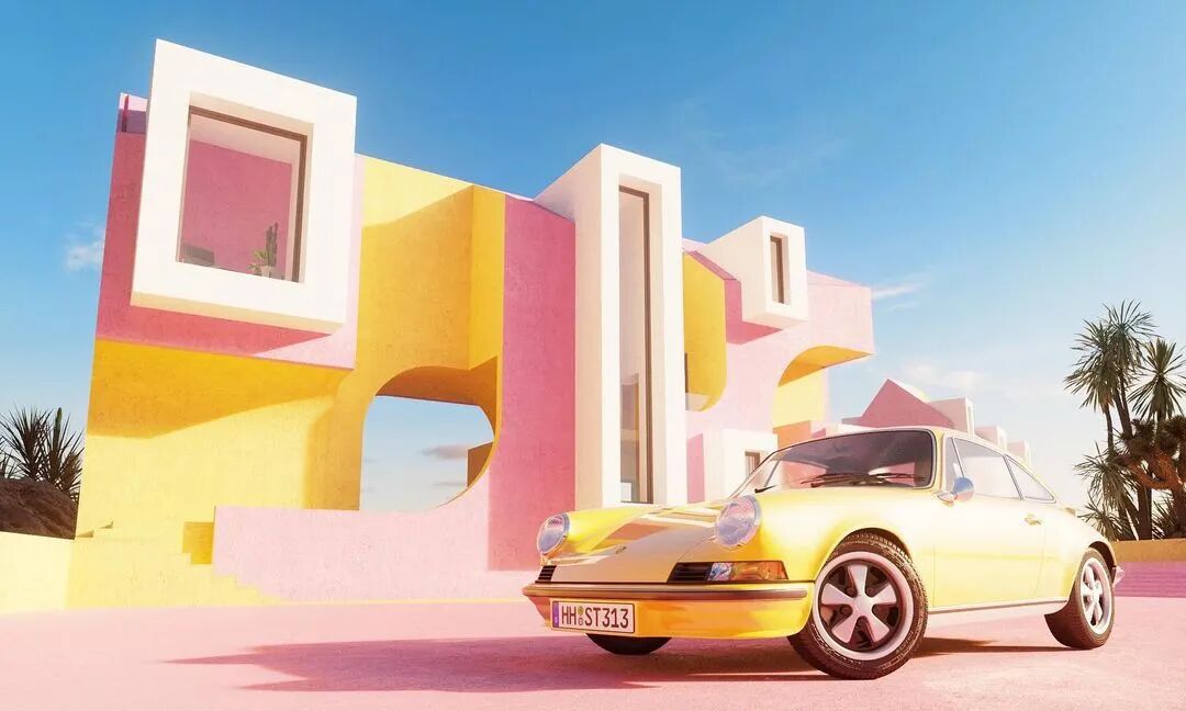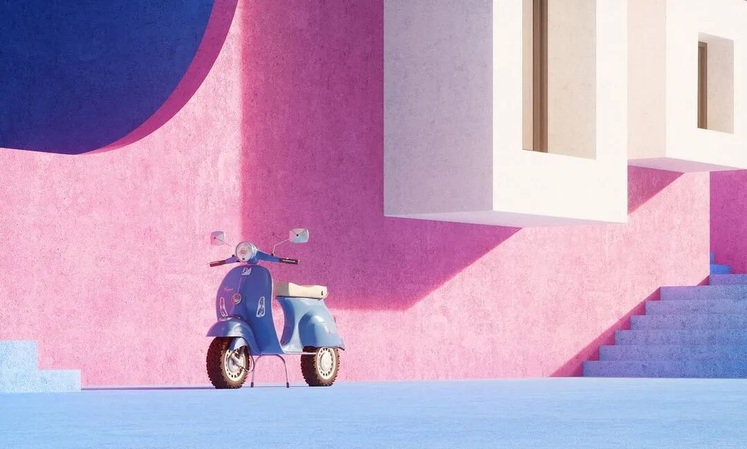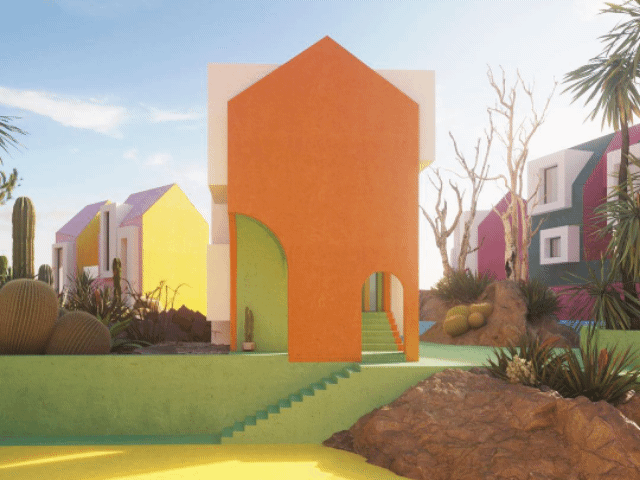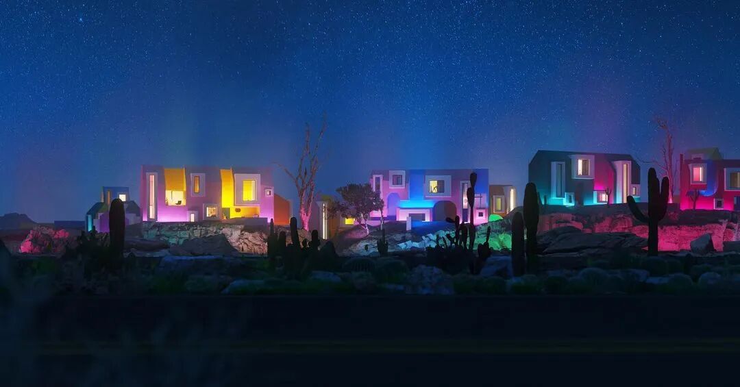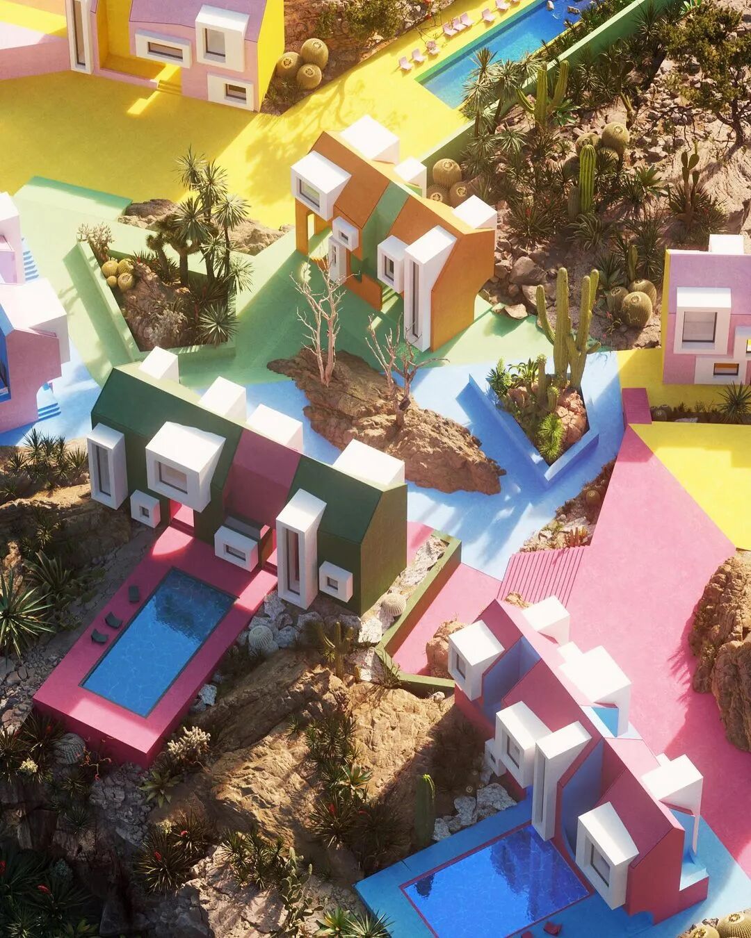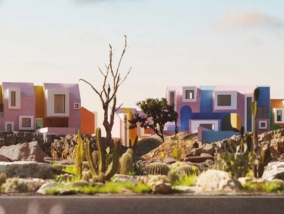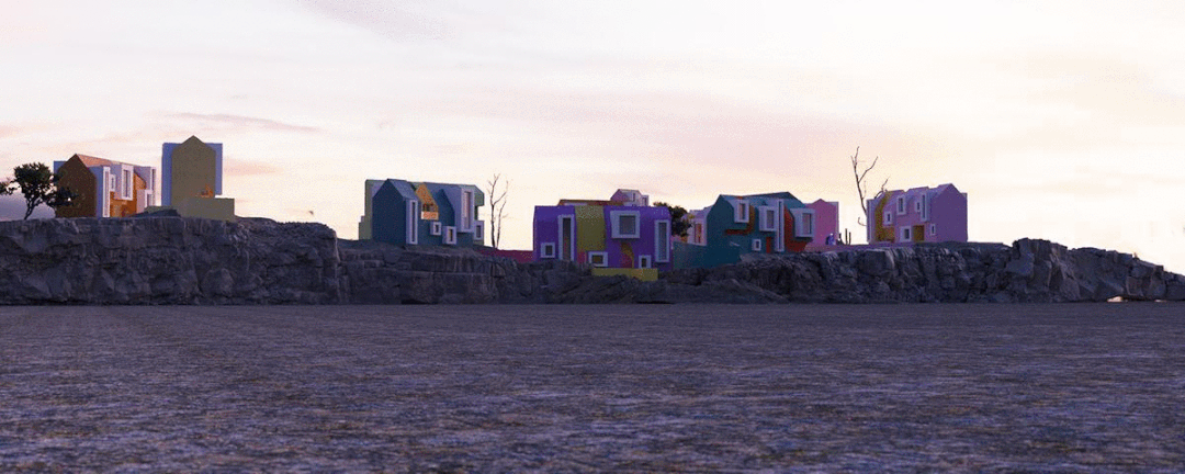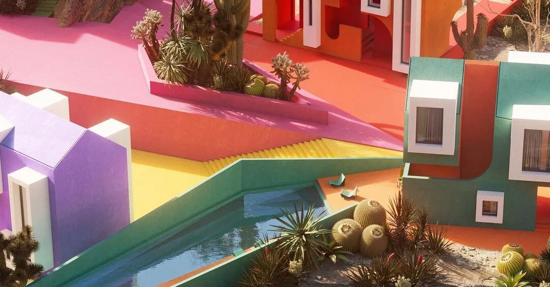 建筑群体以几何形状出现,同时具备各种基础设施,游泳池、绿植、公园等。鳞次栉比、井然有序。鲜艳的色彩与几何的碰撞展现出强烈的阳光与活力。像是孩子们手中的积木块。