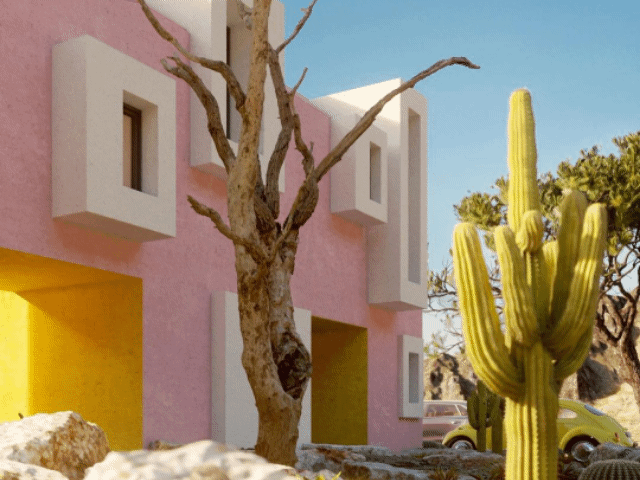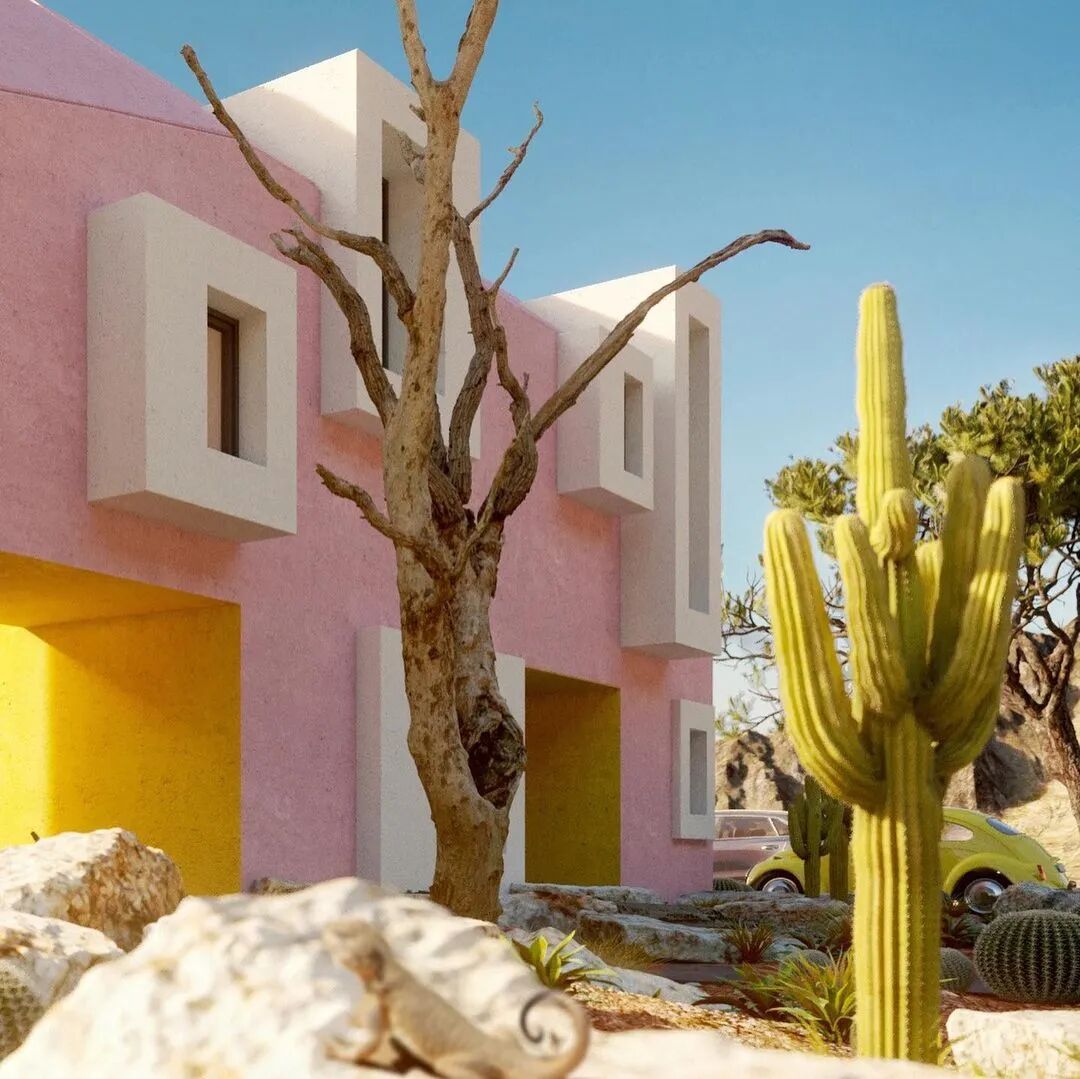楼层不高,仅有两三层的高度。大胆的配色亮眼而有活力,大量的仙人掌让这里更能体现生命的力量。