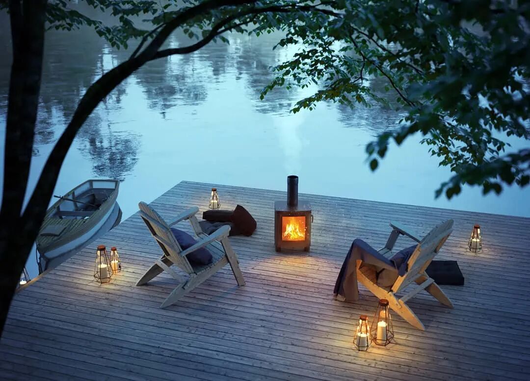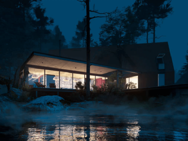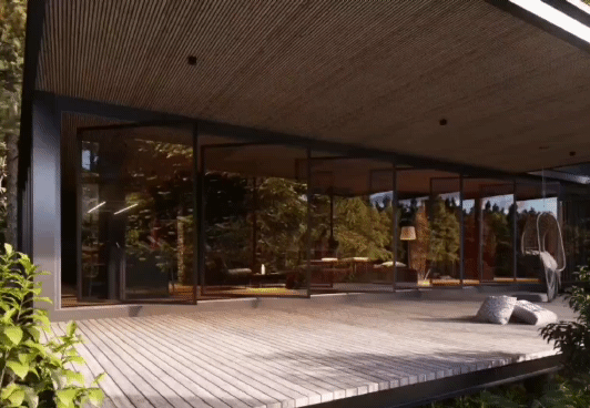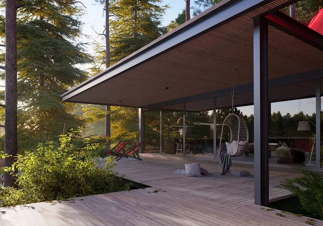 金属构架在这里亮点之一。厨房与餐厅建立在半开放式的空间,几扇玻璃落地窗旋转打开便将室内与室外连接在一起,房屋以45度角朝向湖水,带来最佳的美景观赏点。