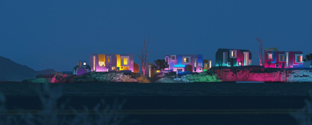 夜晚,在灯光的照射下,展现出别样的风采。社区内的房屋坐落在此起彼伏的小小山丘上。