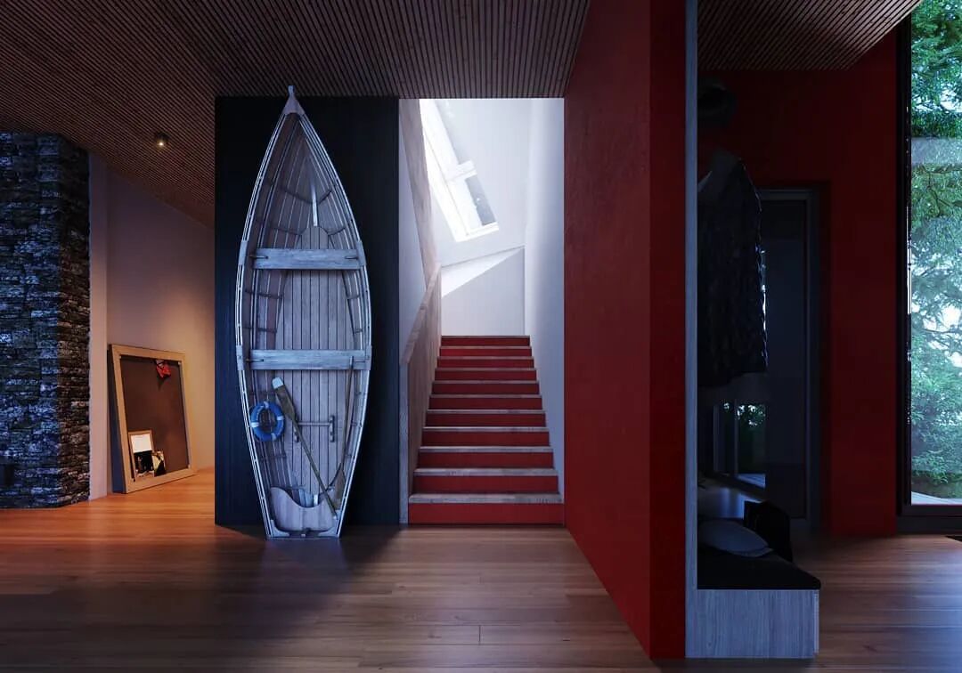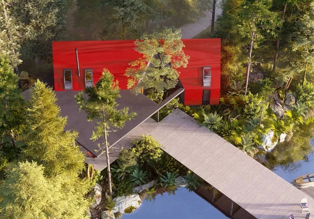这座私人住宅位于美国华盛顿,简约的设计与倾斜的屋顶让住宅更有故事感。住宅面朝湖水,坐落在丛林间,仿佛世外桃源。红色的表面与绿色的树叶之间形成鲜明的对比。