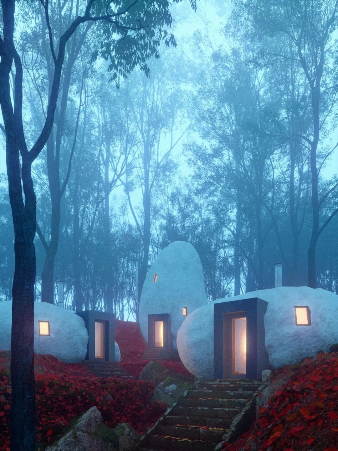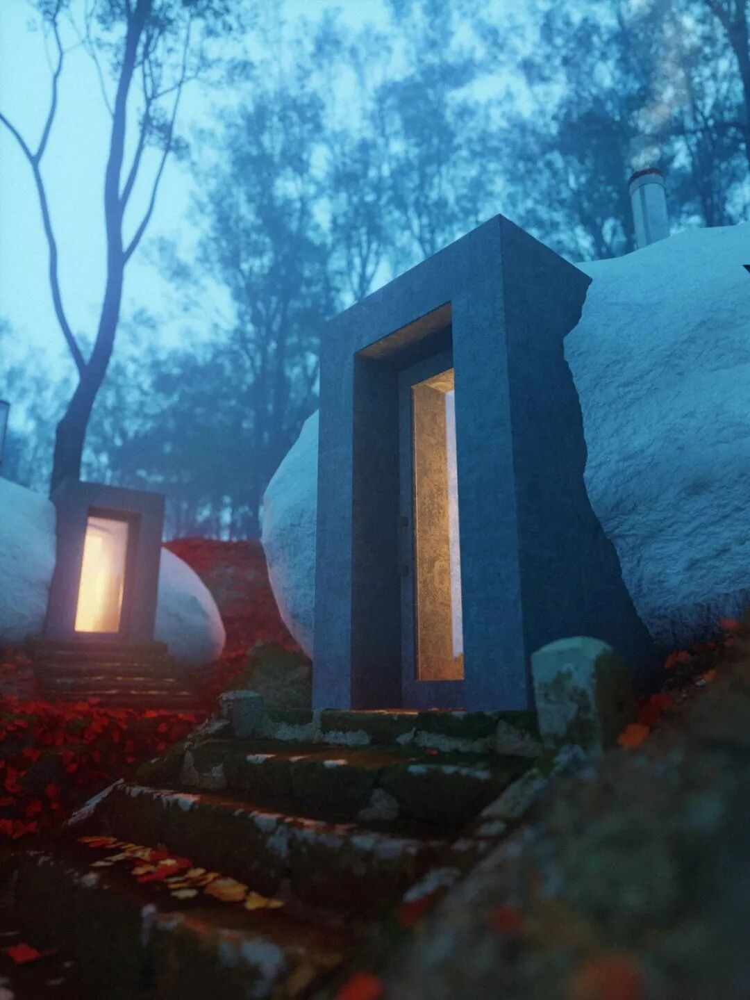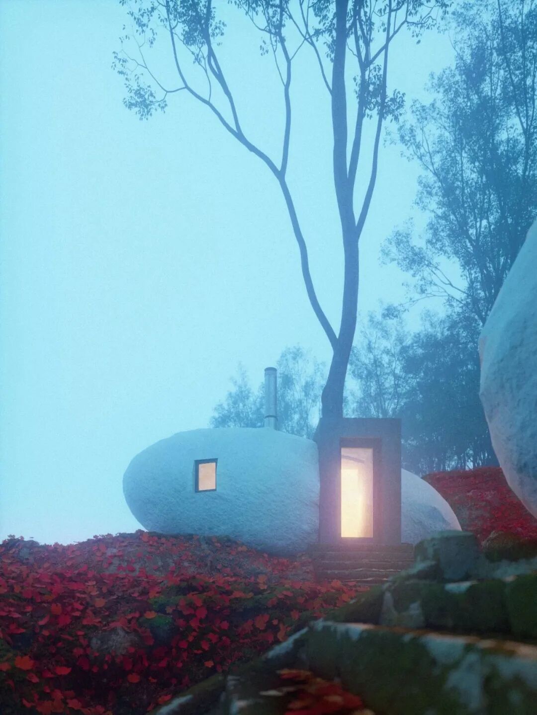 石块并非天然的石头,而是采用有机石料,钢筋混凝土作为主材质,外层砌上仿制天然石材的石膏。两扇玻璃窗留下观赏美景的眼睛。夜晚负责气氛组的灯光让周围变得神秘而迷幻。