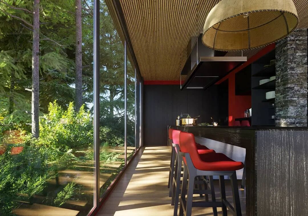 室内可以从多个角度观赏到室外美景,深灰色作为主基调,红色作为点缀内外呼应,也让住宅內部充满活力。极简的装饰让生活回到原始,将生活的本质还原。