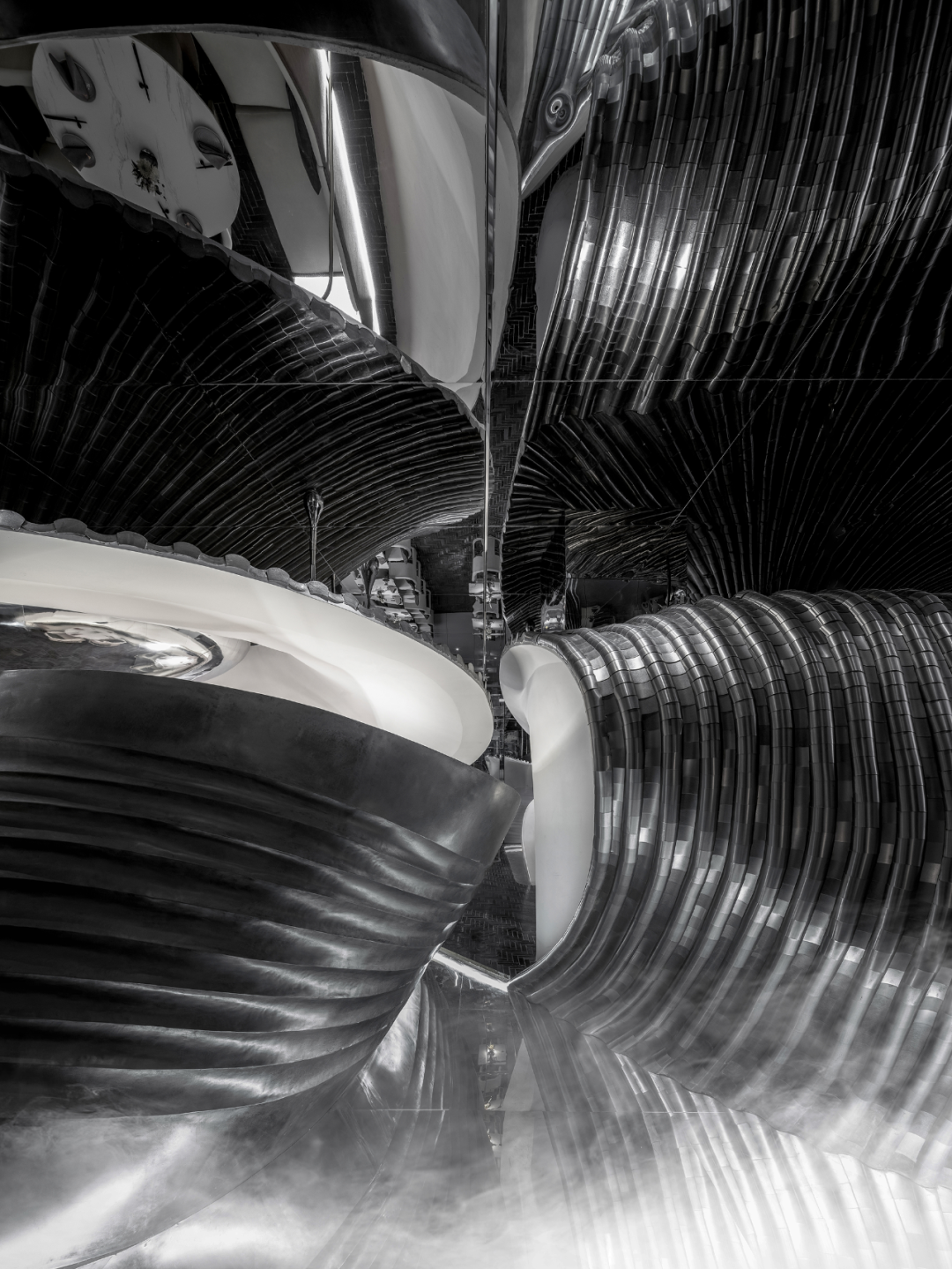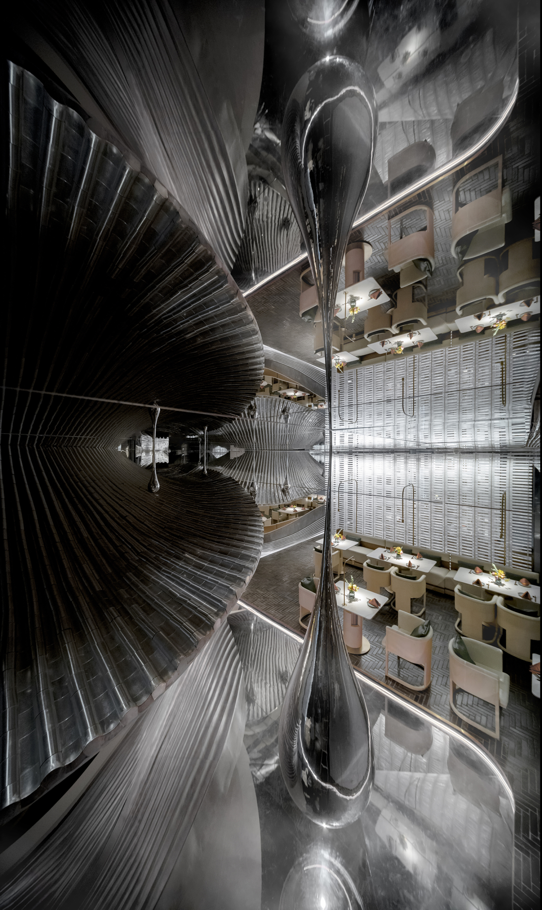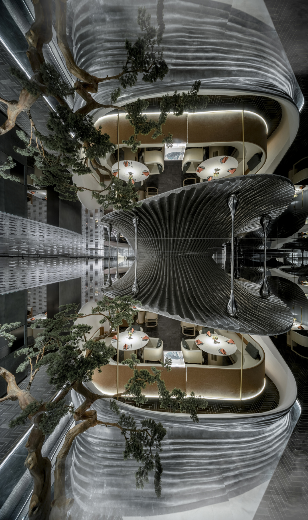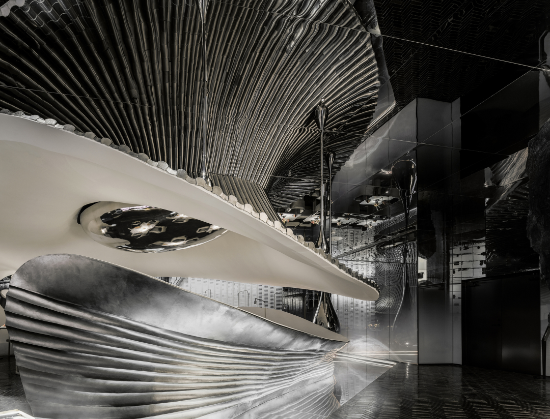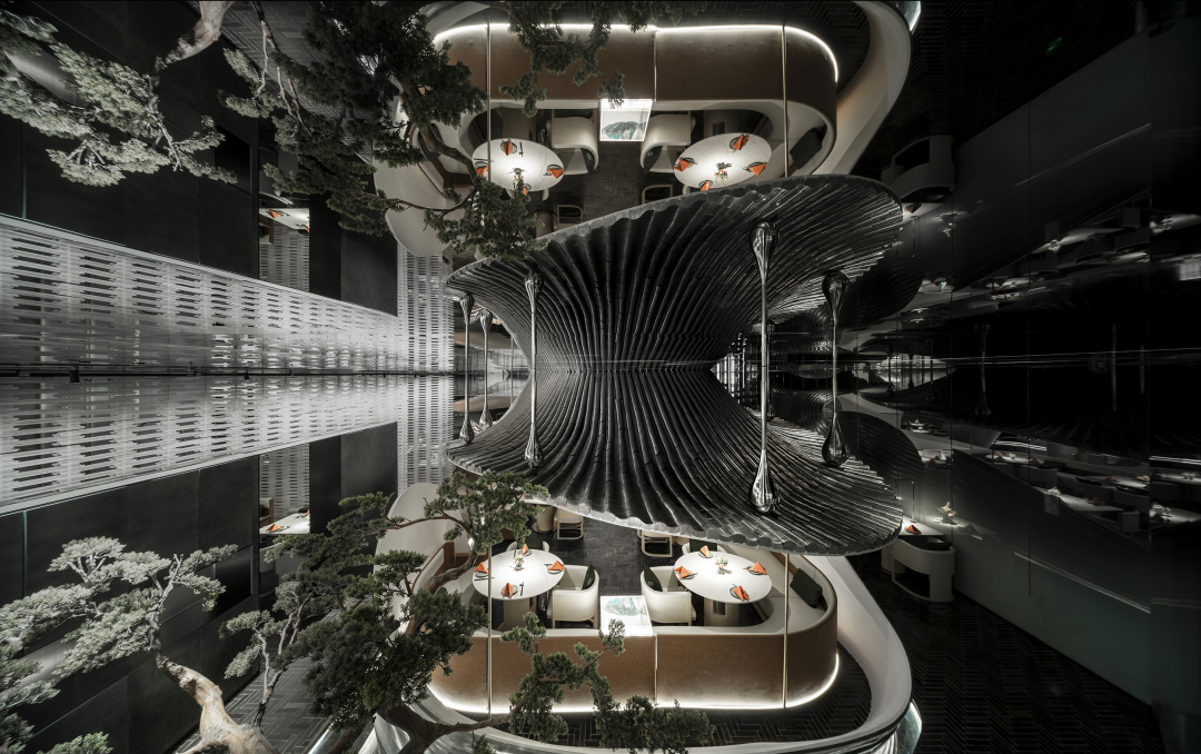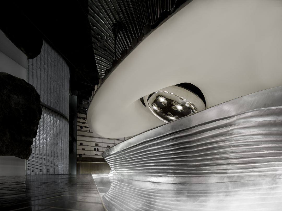 设计师以山水庭院作为设计意向,提取显性肌理作为元素,并在空间之中进行重置和改变,通过形态的抽象,材料的解构,超视觉的构思,将时空折叠,过去、现在、未来的江南山水印象在此交叠,重组。折叠并非对过去的简单重现,而是对过往知识与经验的迭代,覆盖,乃至融合。