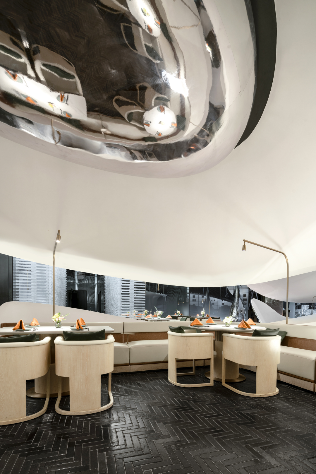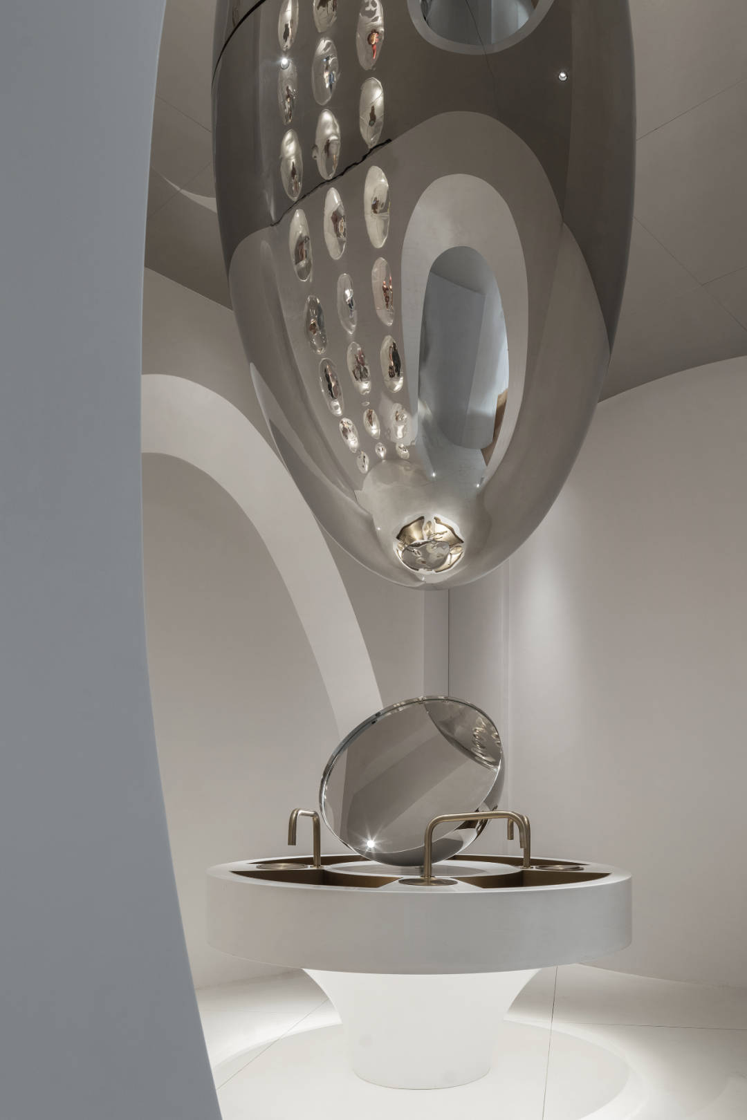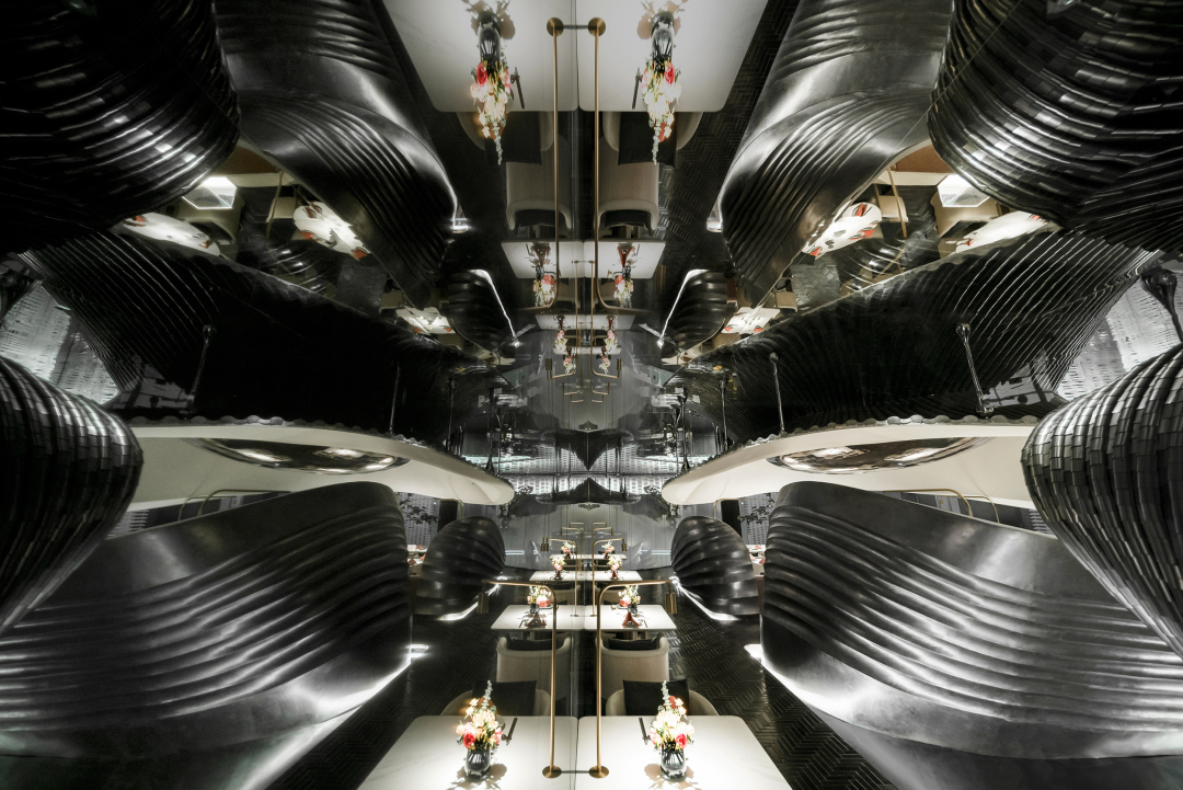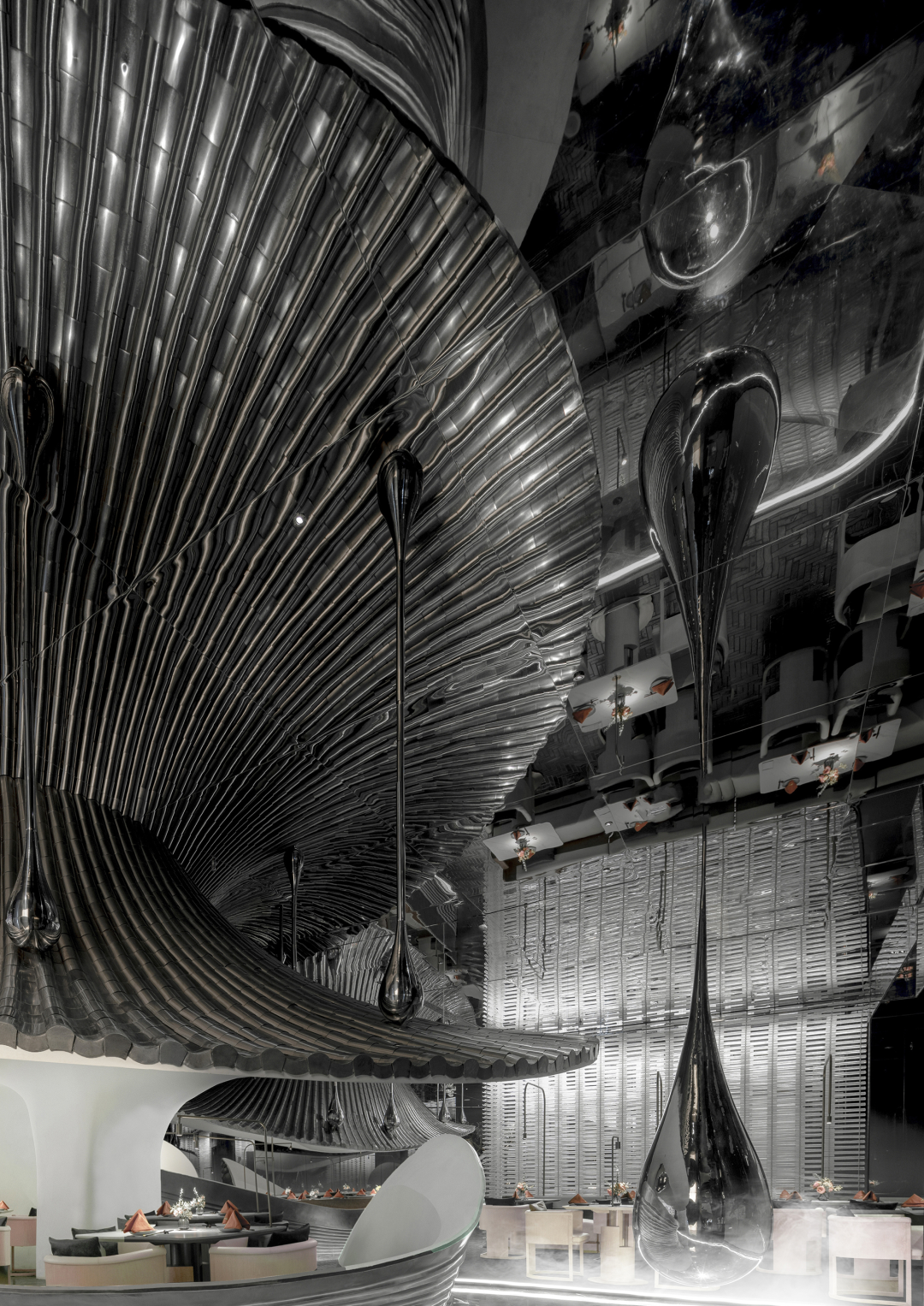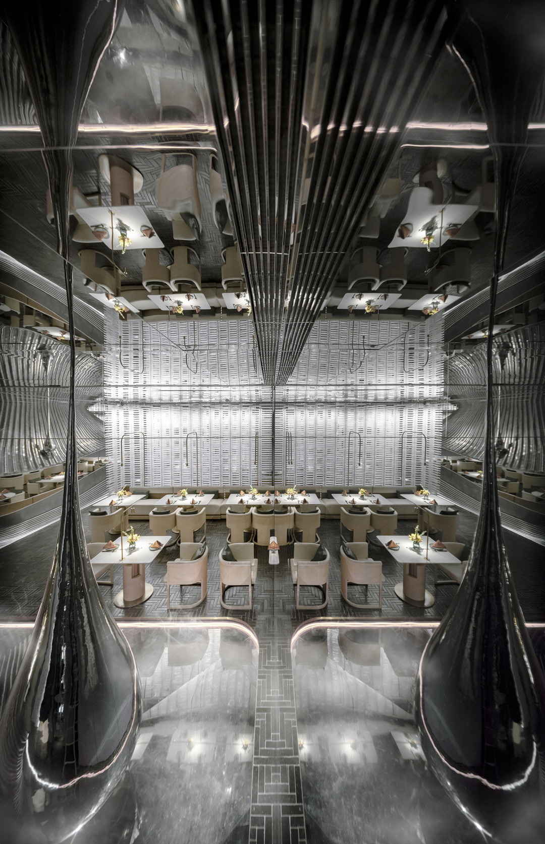 设计师以山水庭院作为设计意向,提取显性肌理作为元素,并在空间之中进行重置和改变,通过形态的抽象,材料的解构,超视觉的构思,将时空折叠,过去、现在、未来的江南山水印象在此交叠,重组。折叠并非对过去的简单重现,而是对过往知识与经验的迭代,覆盖,乃至融合。