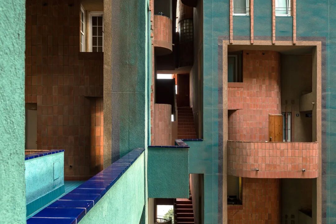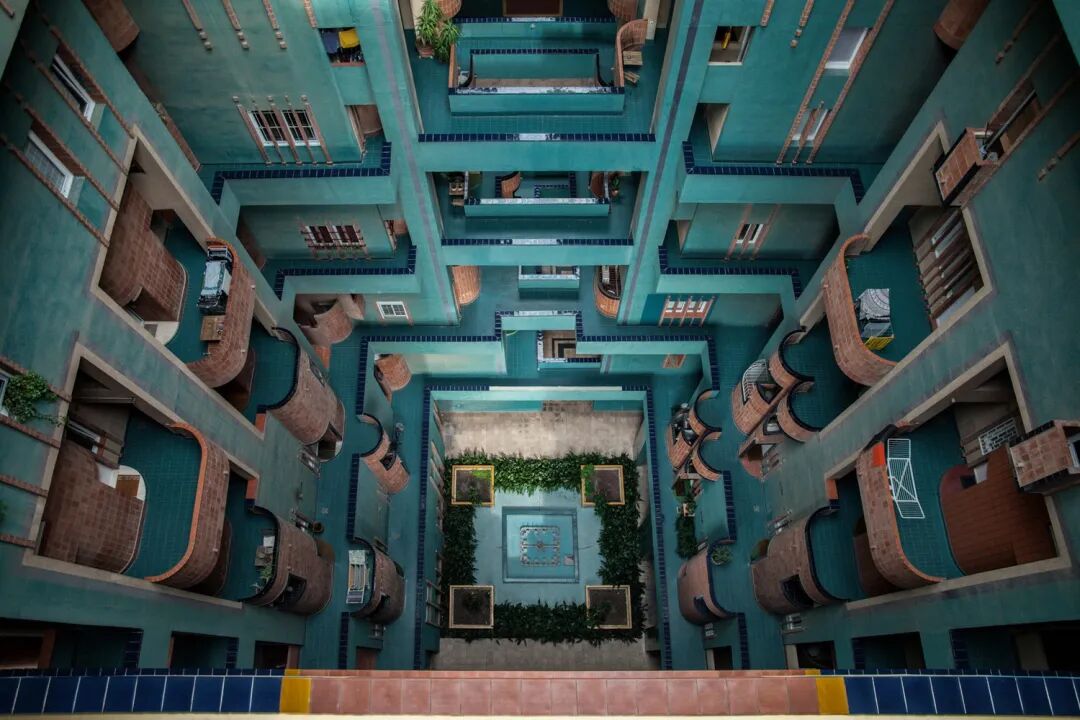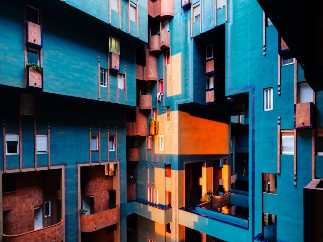 400多间公寓交错的几何结构,再加上复杂的内部桥梁和阳台迷宫,创造了意想不到的视野和亲密空间。建筑采用了大胆的摩尔风格调色板,以增强建筑引人注目的轮廓,有着丰富的陶瓦外观和蔚蓝色的内部。