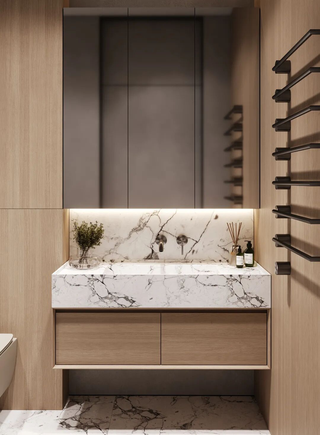 节约空间,小户型的福音。在小户型的世界,最重要的无疑是空间了,在狭小的卫生间里,干湿无法分离,浴缸、马桶、洗手台都必须挤在一个小空间中,如何保证功能齐全且美观整洁好打理,悬浮洗手台最适合不过。因为悬浮,不会让空间看起来过于拥挤而显得局促,小型收纳柜也满足了储物需求,功能齐全,设计人性化,可谓一举多得。