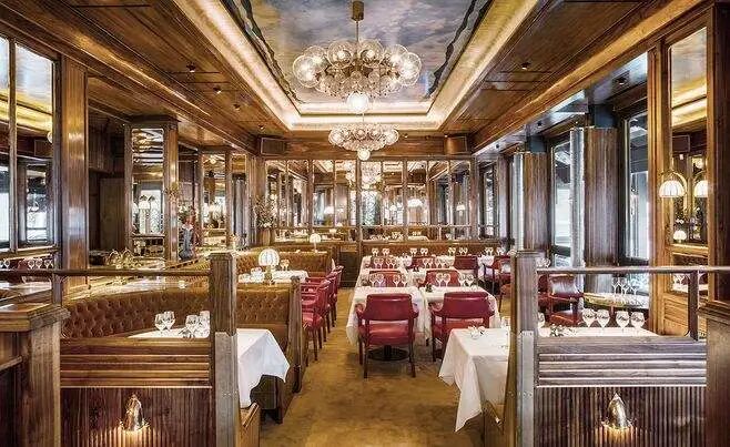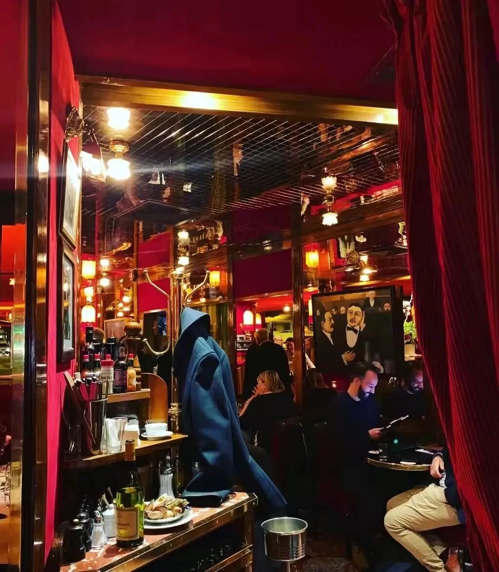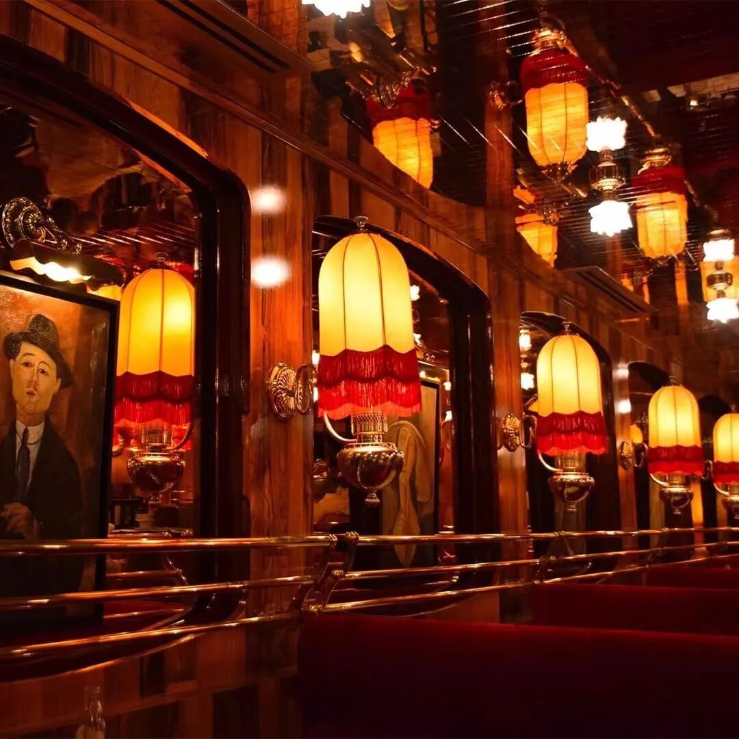 流光溢彩的墙壁天花,柠檬木的餐椅,大红色的幕布,天鹅绒沙发,充满了20年代的梦幻色彩,诉说着巴黎的种种风情。