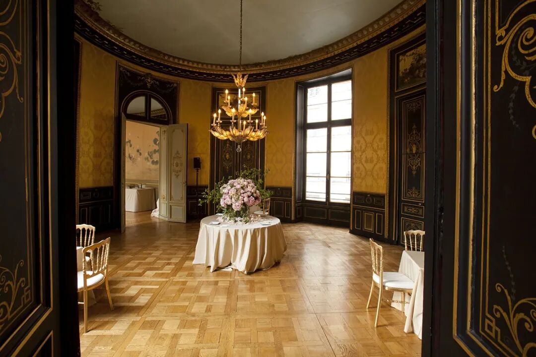 可以看到墙面的装饰,白色的墙面上,金色的装饰线脚,角花上贝壳和珊瑚状的造型。整个空间氛围素雅干净,温柔轻盈,也不失奢华高贵。这是典型的洛可可风格。