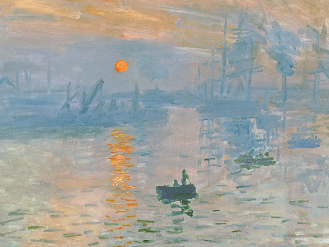 这两句是指莫奈最负盛名的画作绘制于 1872 年的《日出·印象》。