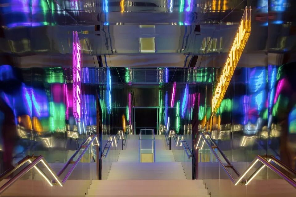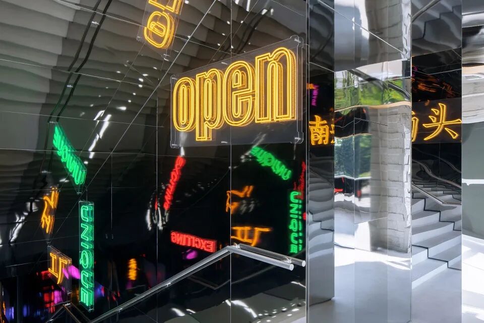 为了对项目进行可持续性地翻新,MVRDV 加强了建筑原有的结构,同时拆除了原有的外墙、暴露出混凝土结构,向人们揭开建筑的历史痕迹。“if工厂”紧挨着一座小广场,MVRDV 在面向广场处设置了一个木饰面的管状入口,如隧道一般的楼梯贯穿整座建筑物,成为一条独特的步行路径。楼梯内采用全镜面的材料,装饰着五光十色的霓虹灯,呼应深圳早期的街市风貌。