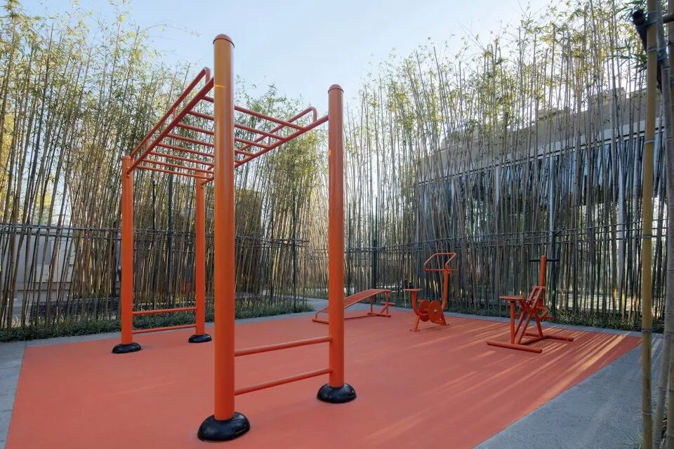 建筑的屋顶以竹林为墙,设置了分门别类的活动区,包括用于表演和活动的玻璃“盒子”空间、休憩区、健身房、蹦床、秋千、茶室、互动式舞台和一面国际象棋的大“棋盘”。这些设施也为城中村提供了快乐的社交和休闲空间。