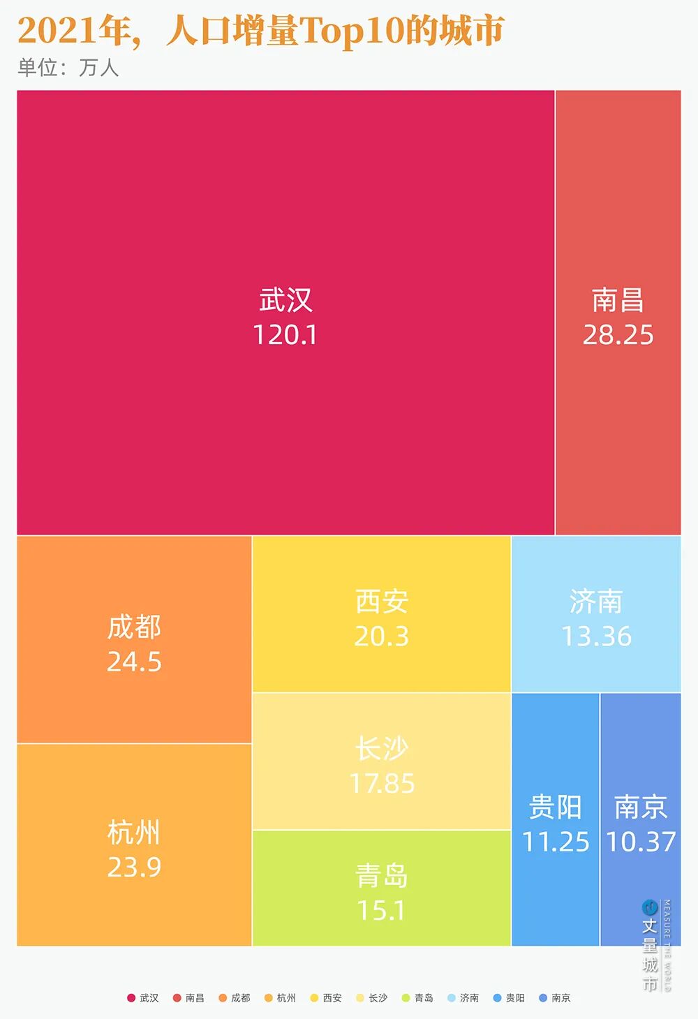 我们再看一下2021年人口增量前十名的城市,分别是武汉、成都、杭州、西安、南昌、长沙、青岛、宁波、郑州、济南,其中武汉新增人口超120万人,位居全国第一。