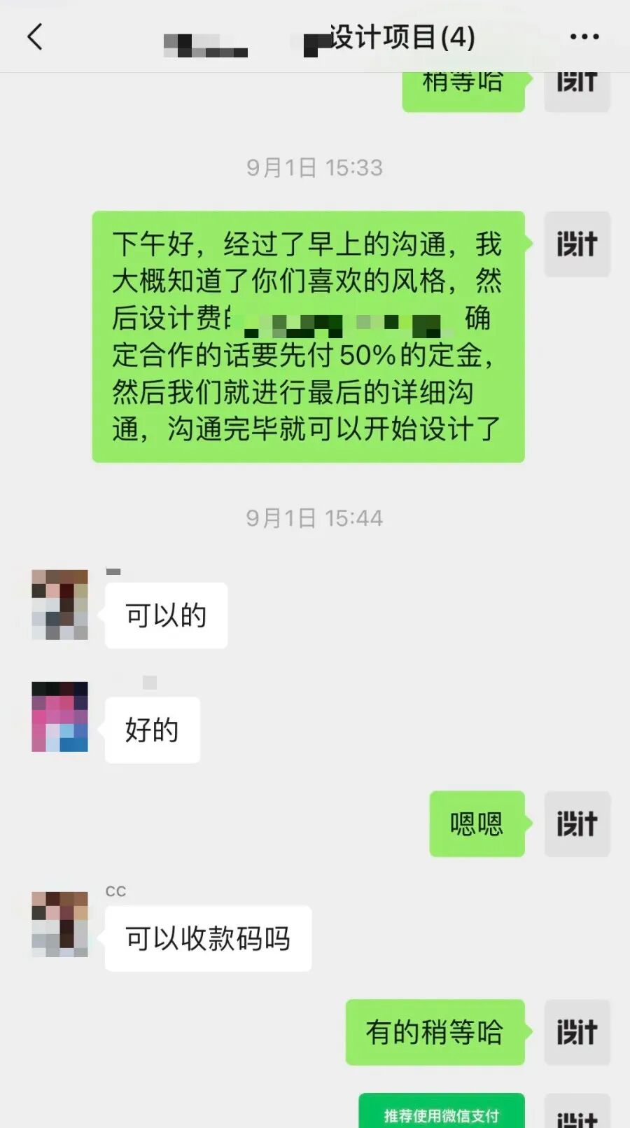有很多脸皮薄的设计师都不敢开口要定金,这个真的要改,不是每个客户都那么善良主动说先给定金的。