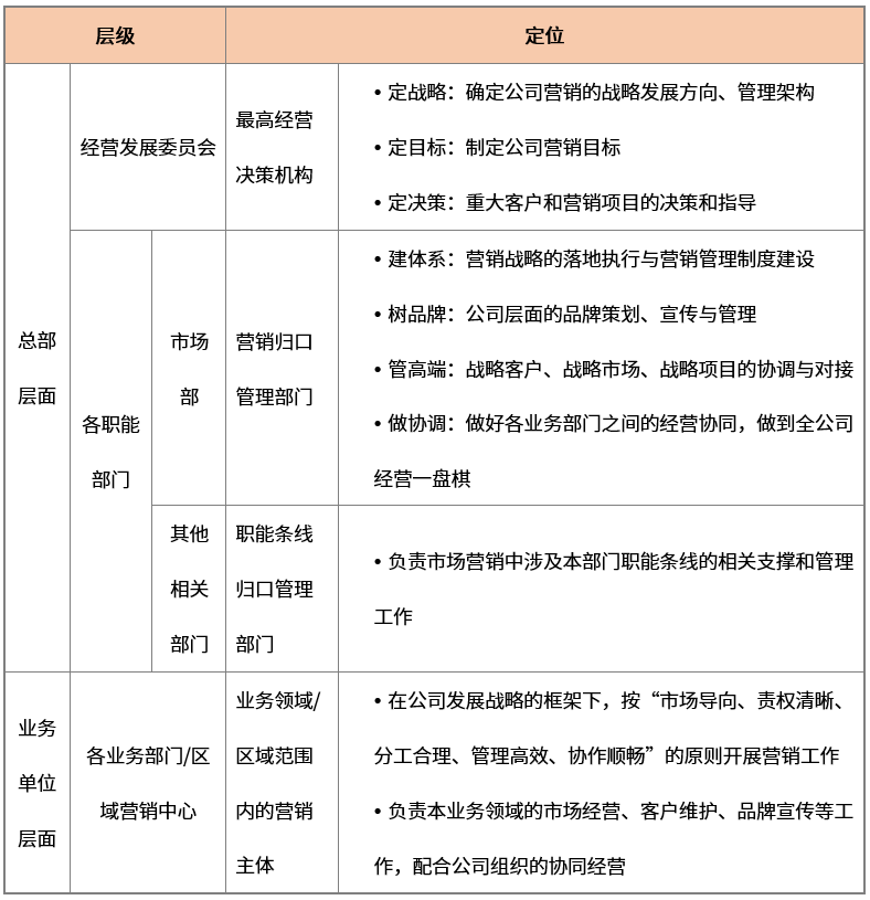 设计企业可以遵循“前线高敏捷化、后台高赋能化”的原则,建立“经营发展委员会-市场部-生产部门/区域营销中心”的立体营销管理架构。具体可以参照表1。