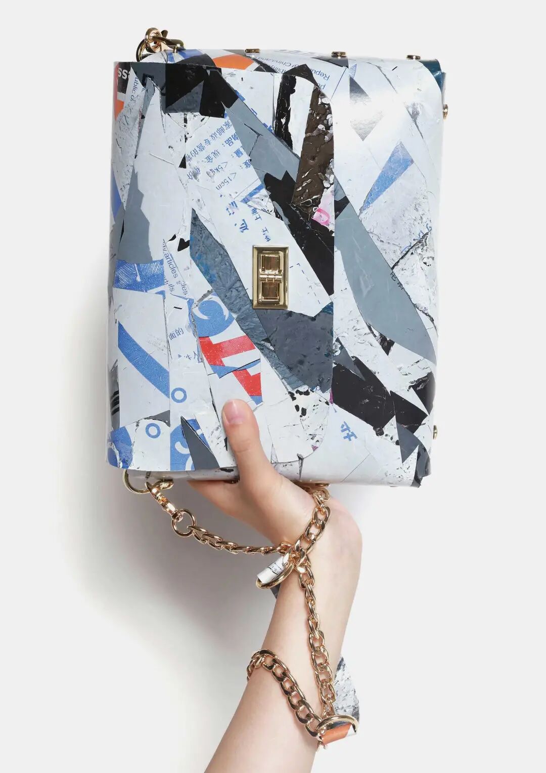 重塑后的再生材料相比塑料包装具有更高的柔韧性和耐磨性,质地更类似于植鞣革,因此可以用来做包包的设计,而原本快递包装的一些图案和颜色可以被保留下来,作为一种独特的装饰材料风格。