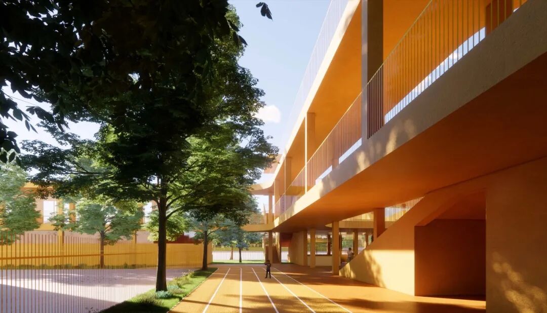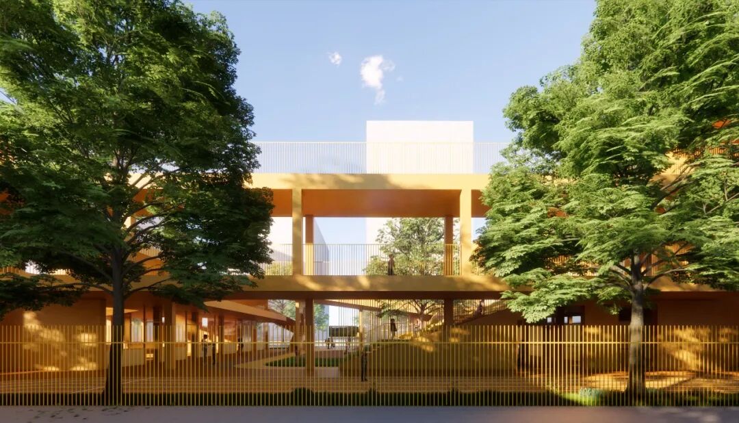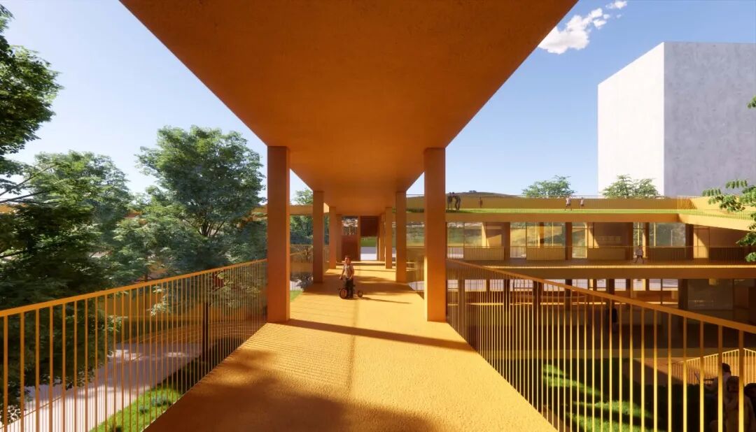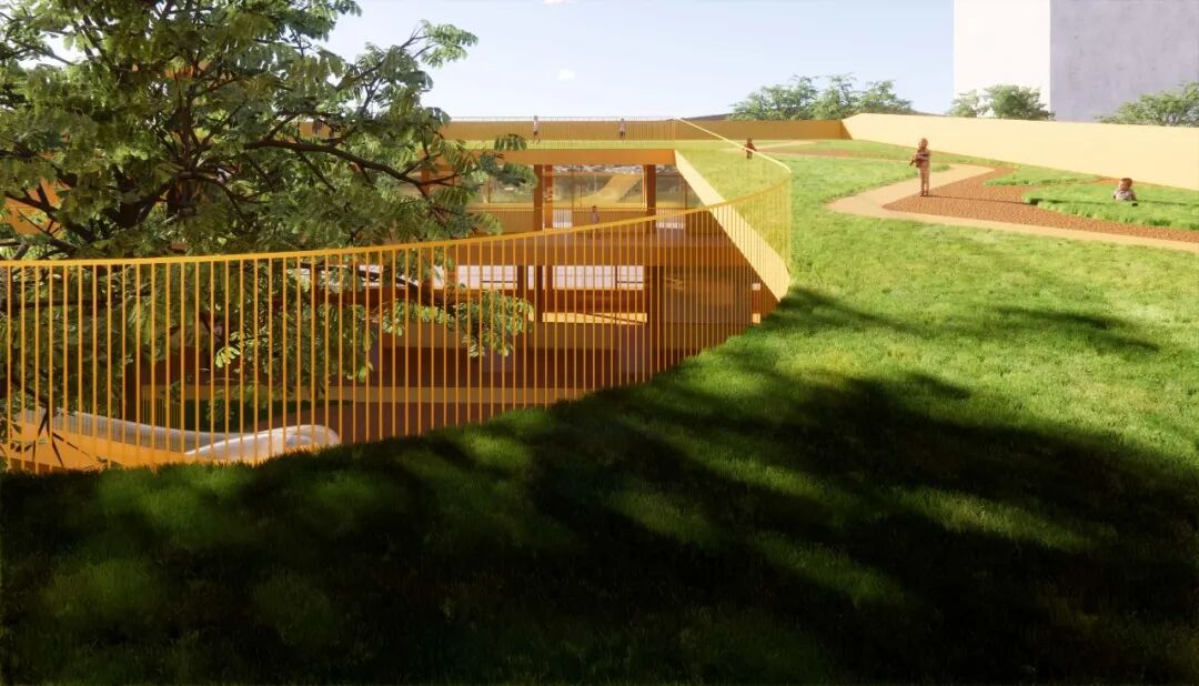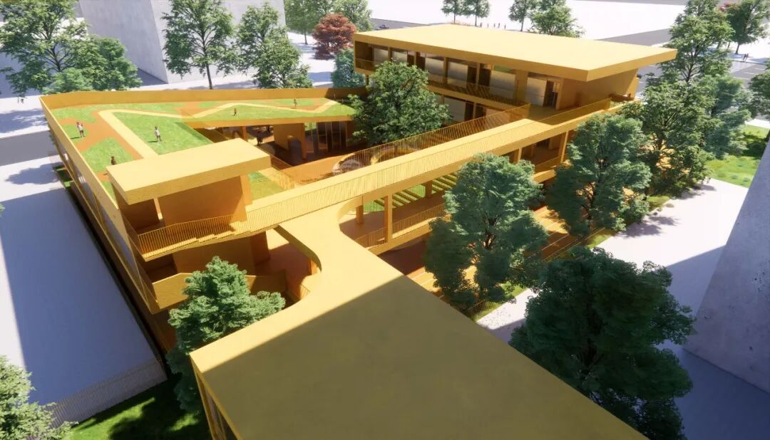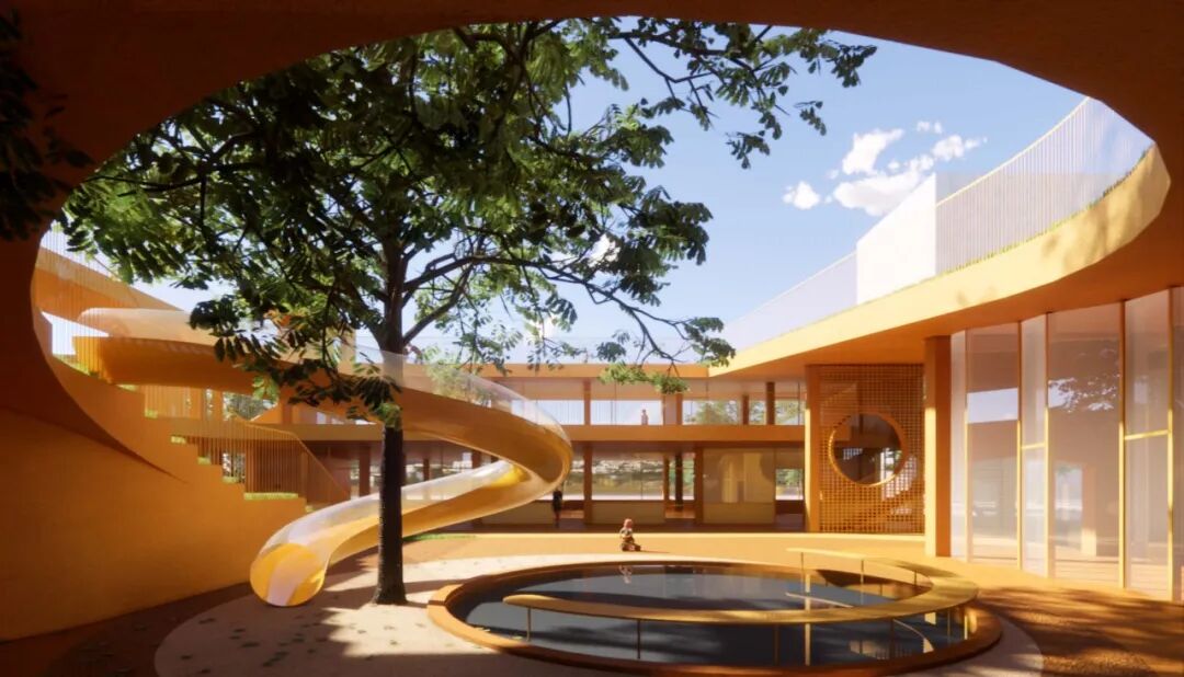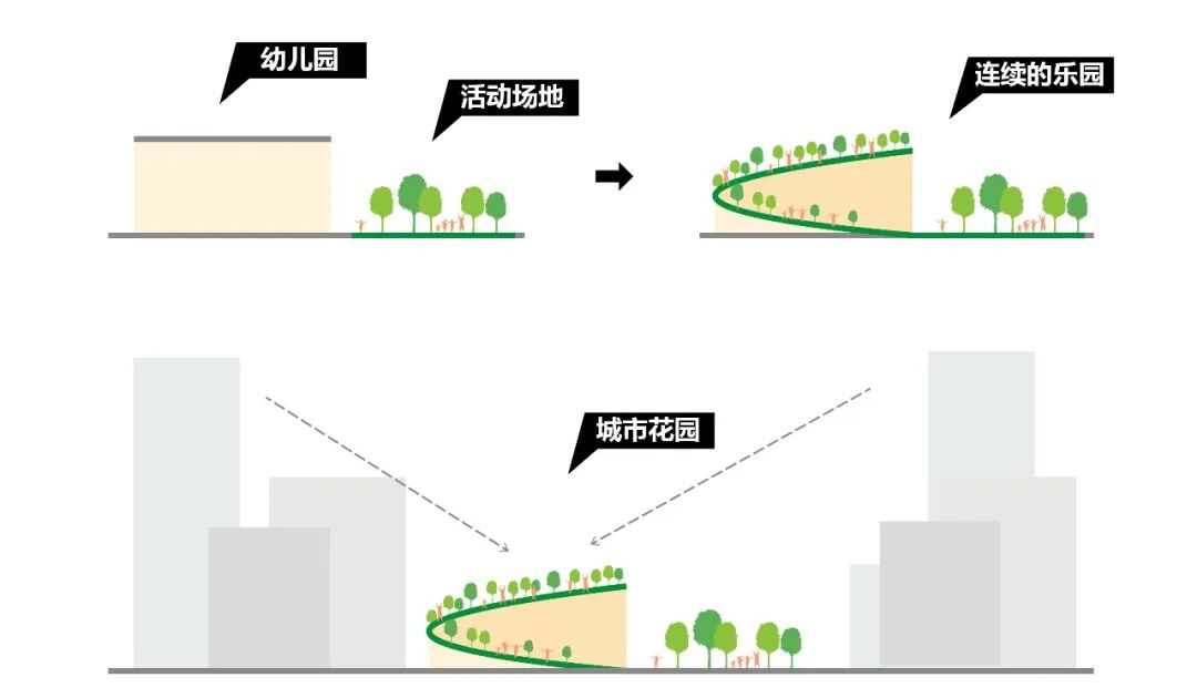 这个是竞赛中标项目,目前在建。幼儿园的场地相对有限,坐落在繁华都市的街角边,建筑密度很高,且由于场地严苛的退线要求使得可建设区域及日照条件都不是很宽裕。而孩子们的早期成长有着很大的户外活动的需求,因此整个设计希望能够在有限的空间资源内最大化地呈现幼儿活动的场所。也因此形成了围绕着中央庭院的建筑体量,从一层到二层逐渐盘旋上升,形成连绵的绿植屋顶给孩子们提供广阔自由的活动场所。同时,连续的绿植屋顶对于周边高耸的城市建筑而言也是非常友好的,提供了一片从楼上可以远眺的美妙的城市景观。