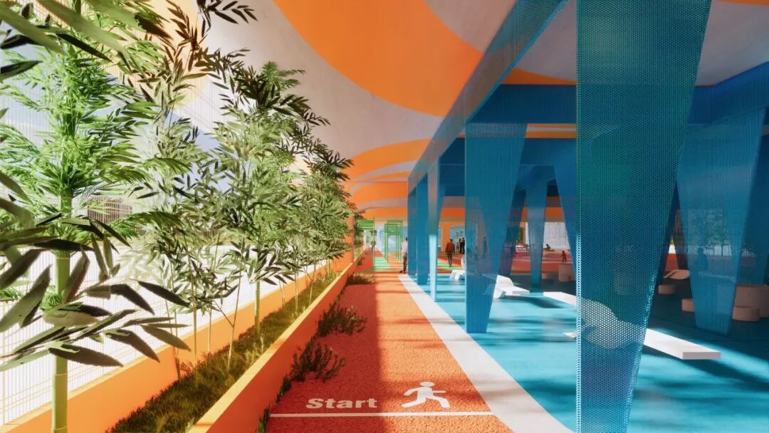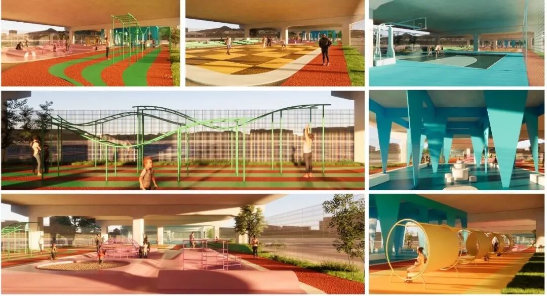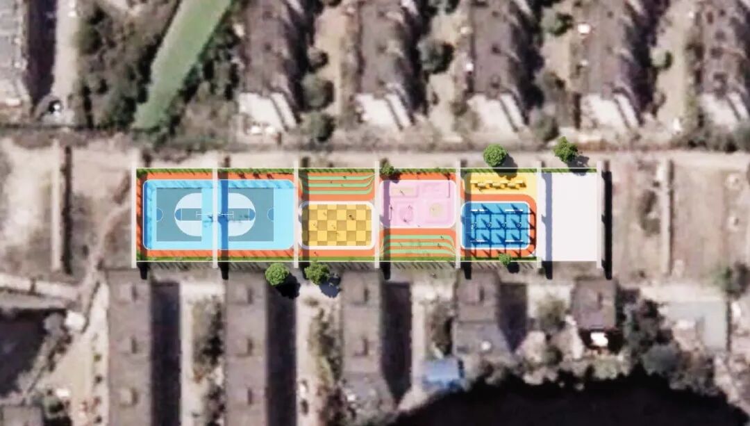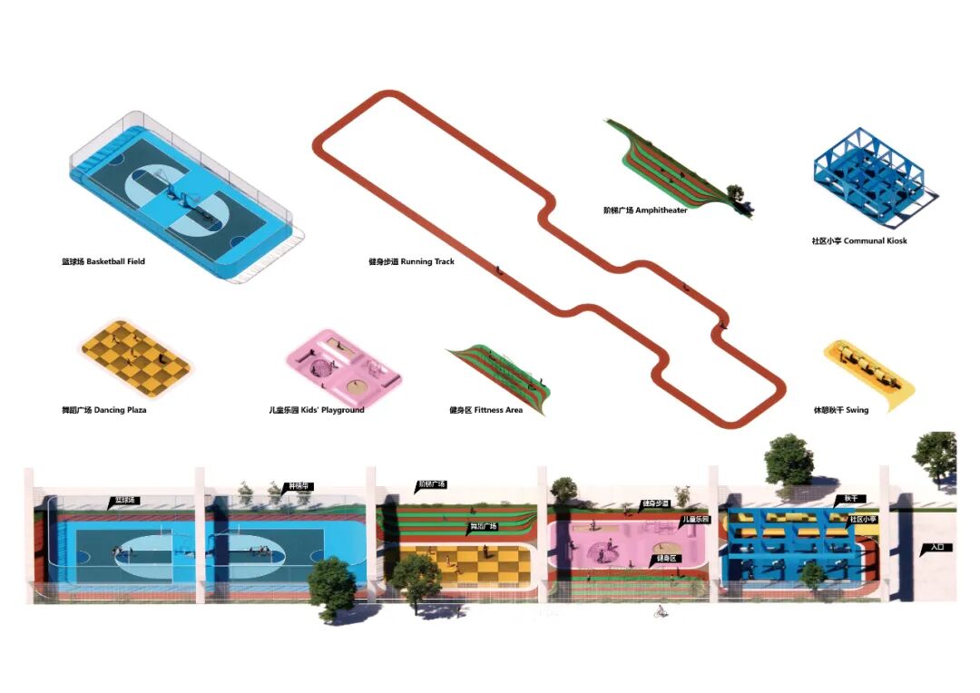 项目的场地位于高架道路的下方,由桥架梁柱的结构单元划分出一格一格的空间是这一场地的特征。因此项目的功能区域划分和组织都以此结构单元网格为基础。通过把单调的长方形的健身步道进行错位和扭转,一方面使得健身步道本身的体验更加有趣,另一方面也因此在步道和外侧的场地围栏之间多生长出了三个狭长的活动区域,最终形成了多种不同尺度的活动场地,分别从大到小依次为:篮球场,社区小亭,舞蹈广场,儿童乐园,阶梯广场,健身区以及休憩秋千。大大小小的活动场地由健身步道进行串联,使得整个区域丰富生动和有趣。因此,社区中的不同年龄段的人都可以在此地找到他们的乐趣所在。