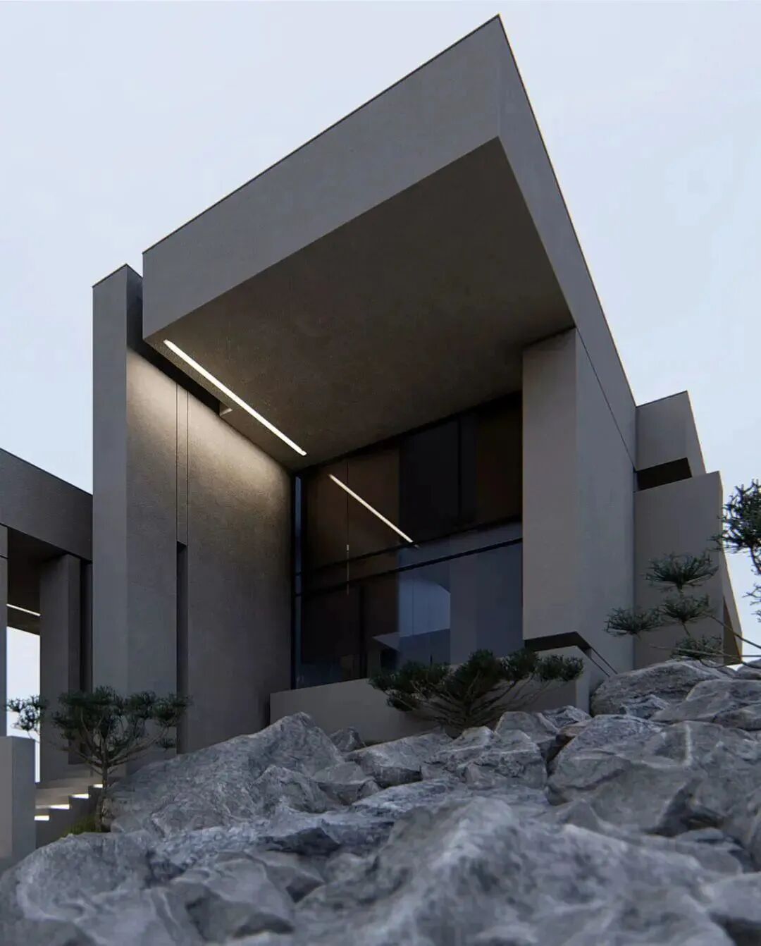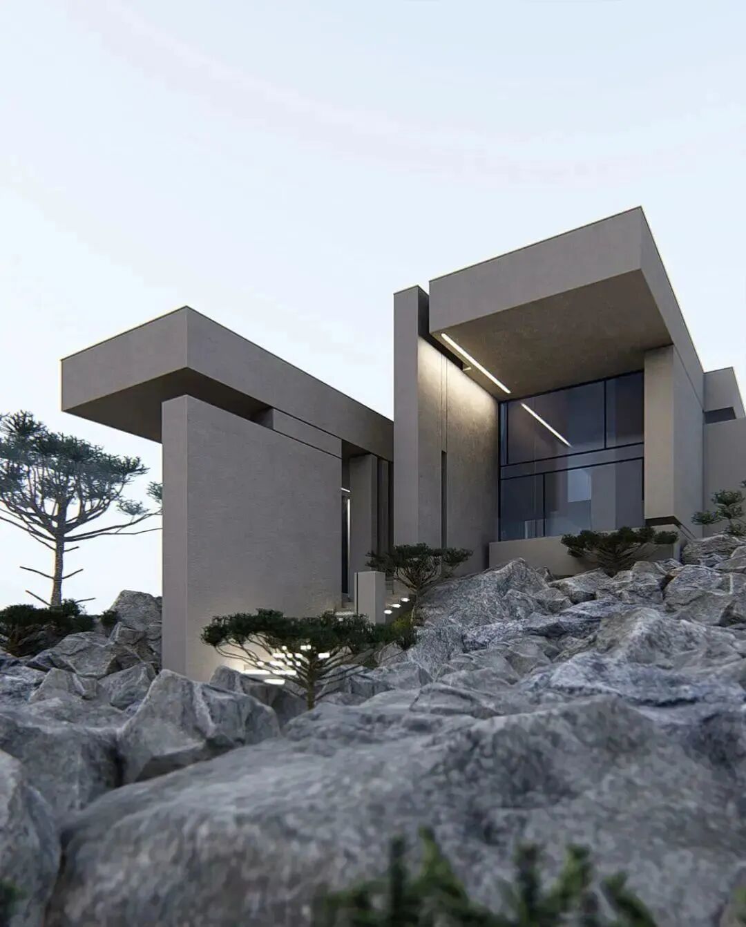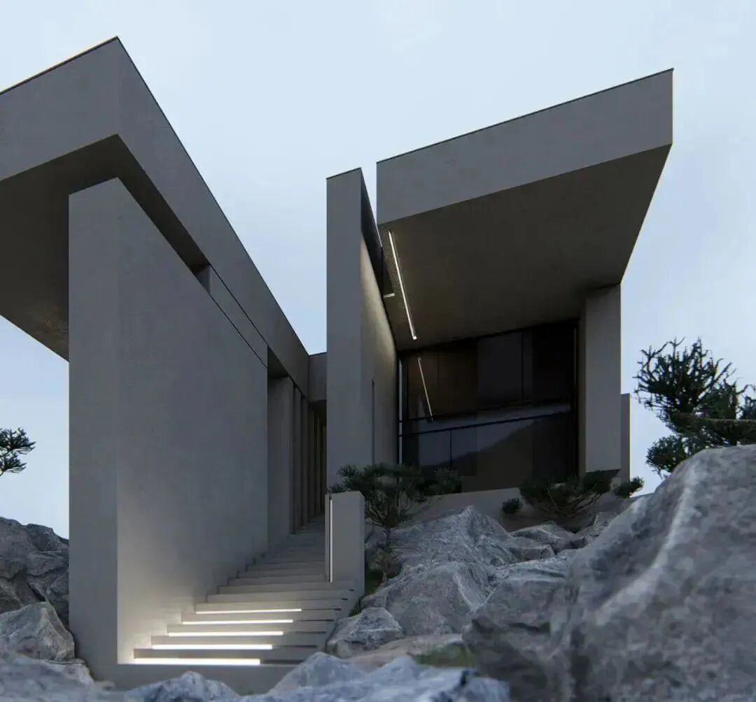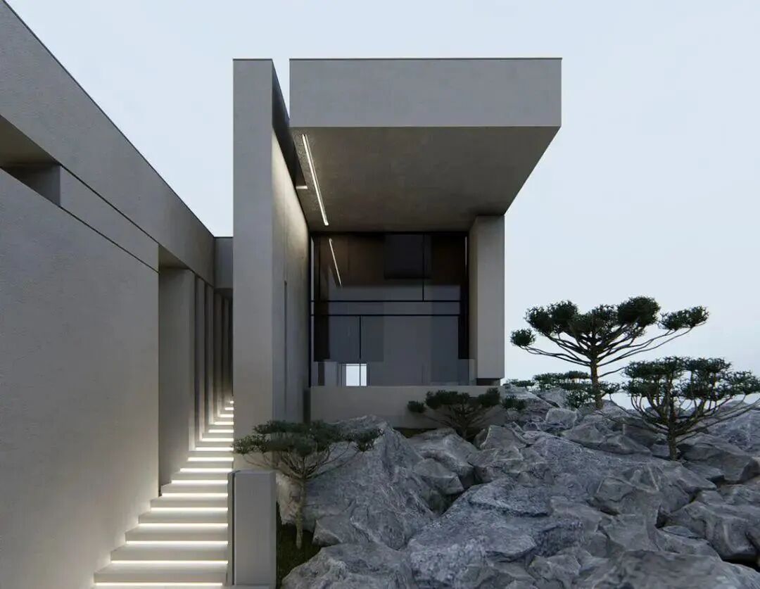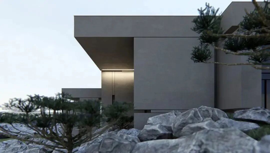 规整的几何体,错落有致排列,既能规划不同功能的空间,又可以保持设计感的外观。周围绿植与山石的搭配,凸显了居住空间融入自然环境的画面。