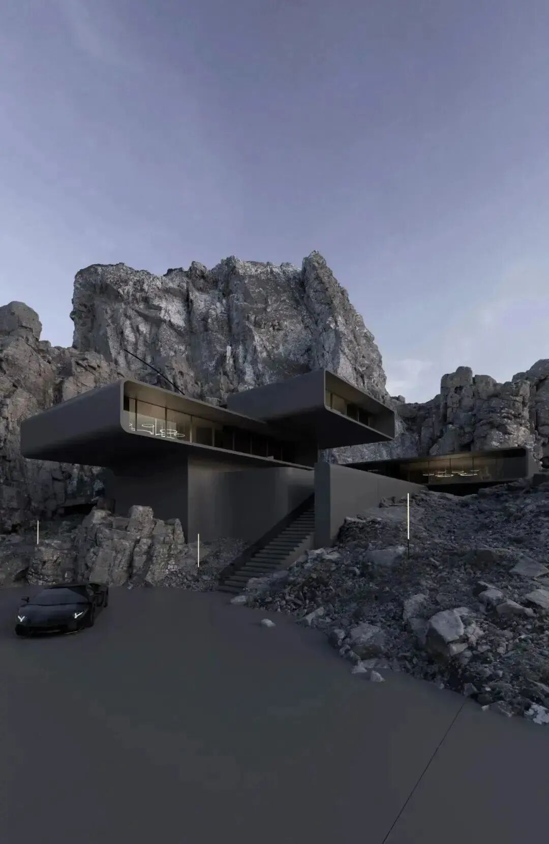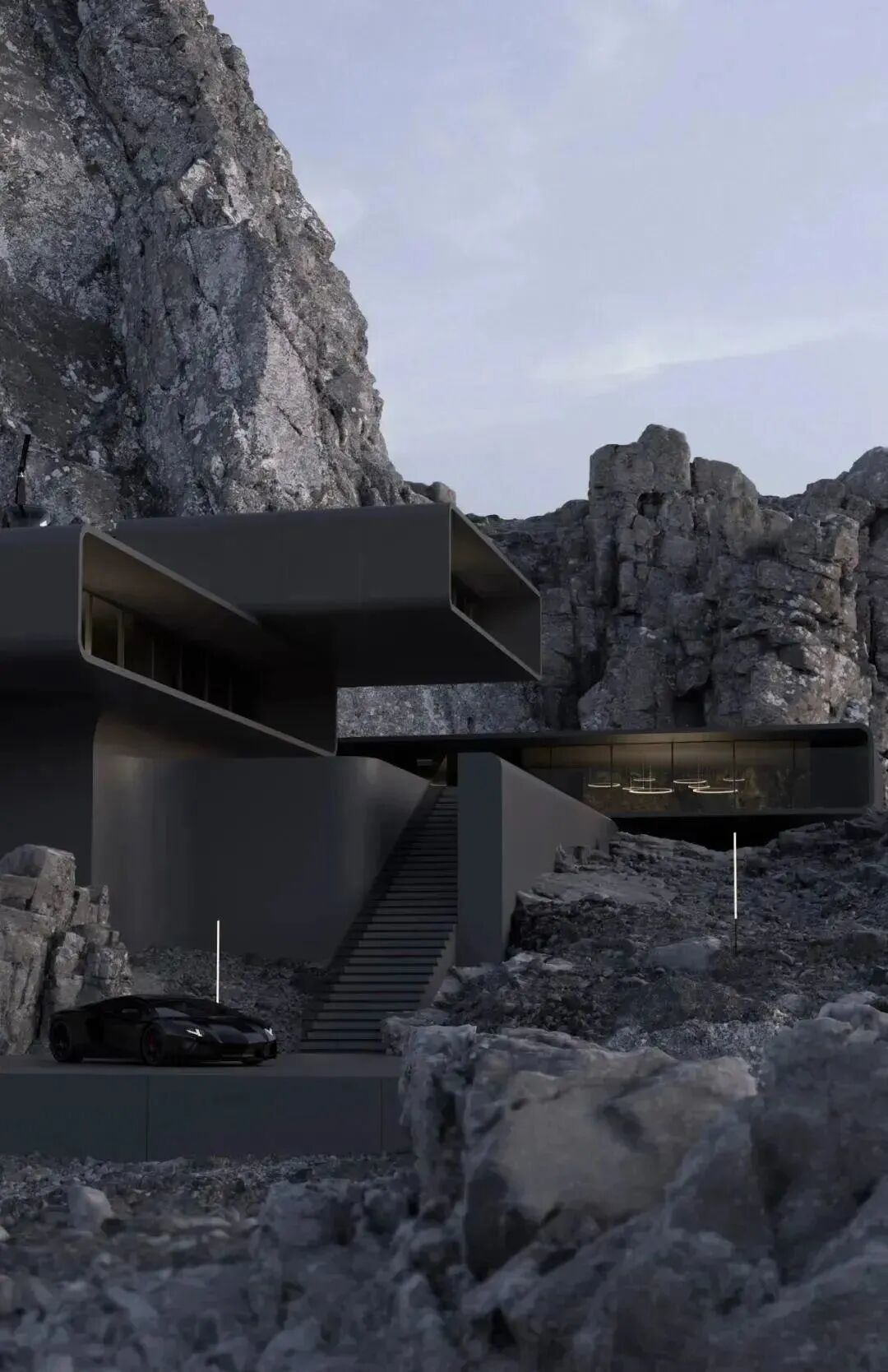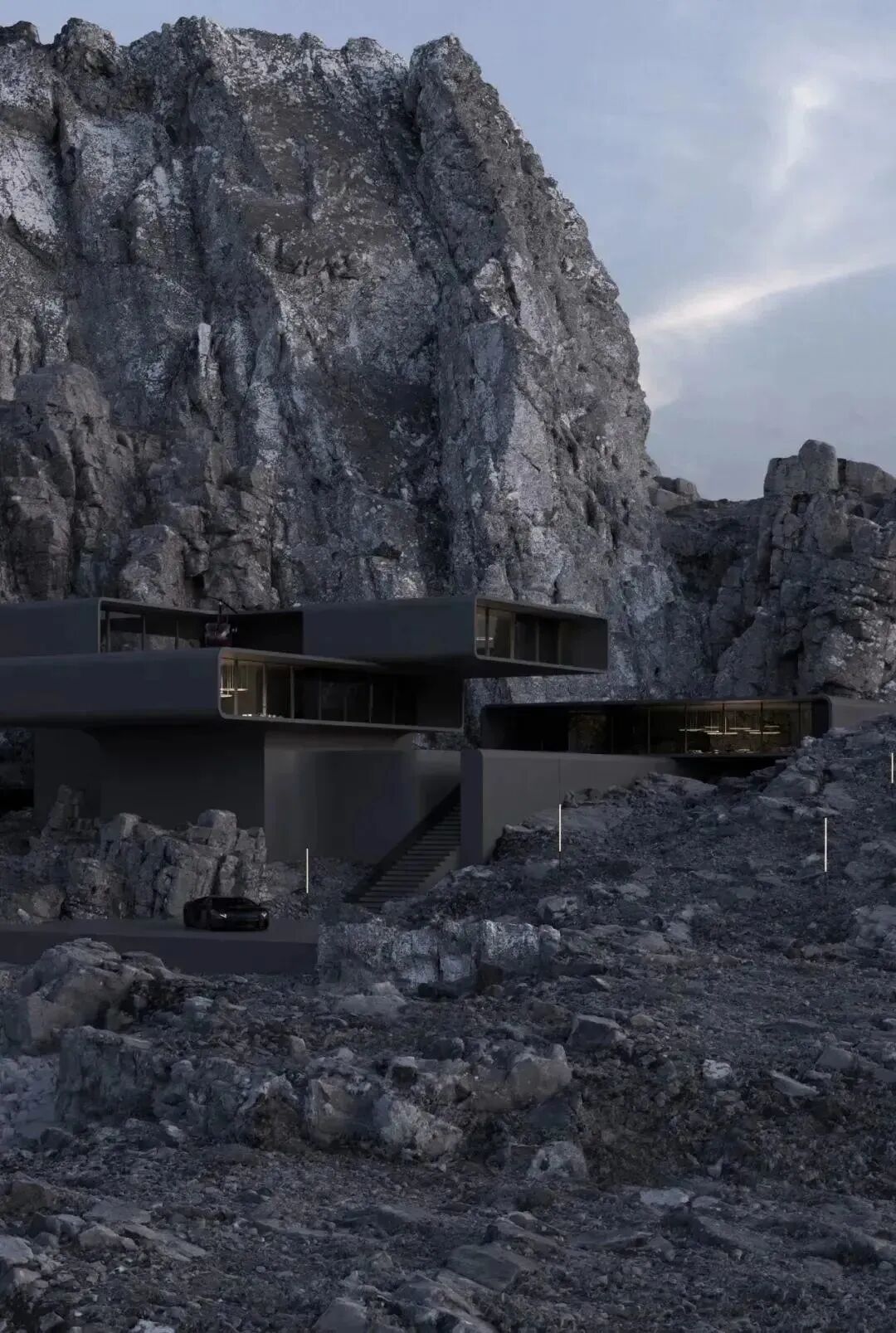 山岩、峭壁林立,自然与人造结构刚性之间的并置,突出了建筑的美感。