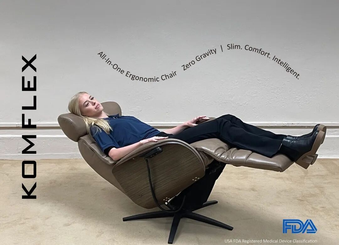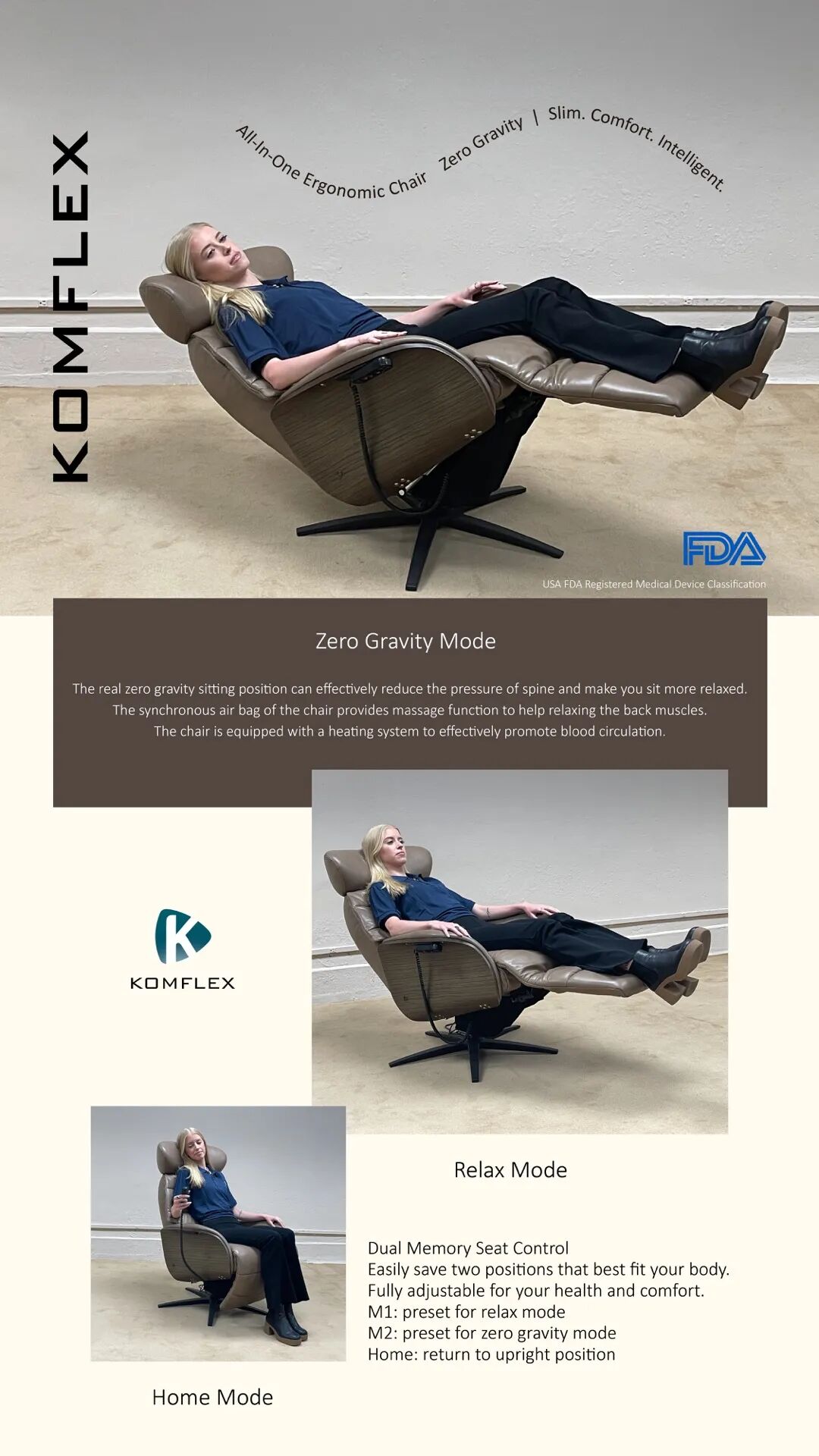 KOMFLEX 康研创作是年轻有活力的家具集团,由一群追求突破传统想要开发最好的多功能人体工学椅的专家所创立。追求卓越将科技融合永恒的家具设计美学。通过美国研发团队多年坚持不懈,康研创作成功推出创新专利美国 FDA 医疗等级认证的零重力多功能护脊健康椅,智能的设置完美配合优雅的座椅设计为您带来更舒适健康的体验。