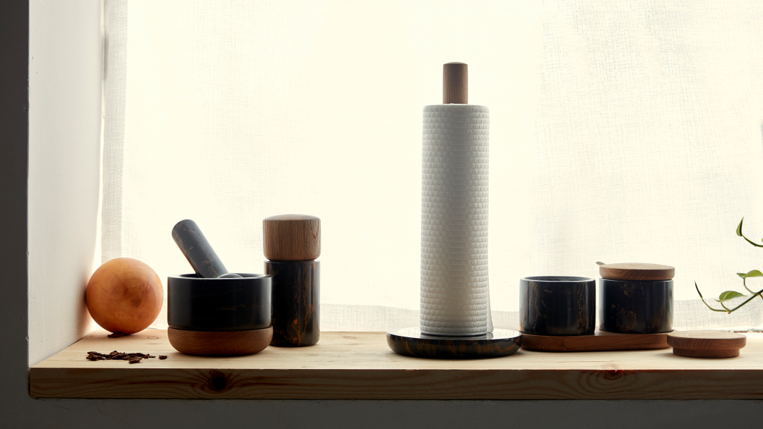 Vein 大理石系列为实用性强、高颜值的厨房工具,采用罕见的黄色花纹天然大理石,与白橡木的优雅纹理相呼应,为使用者带来愉悦的美学和使用体验。
