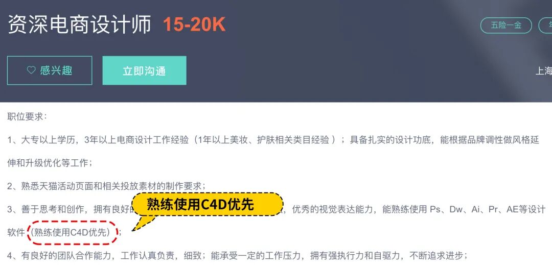 对于很多品牌来说,人力和财力有限,C4D不仅可以满足其宣传上的三维立体需求,而且一人或许就可以完成,能够很大程度上节省成本!因此现在很多公司在招聘设计师时就已经明确要求“熟练使用C4D优先”: