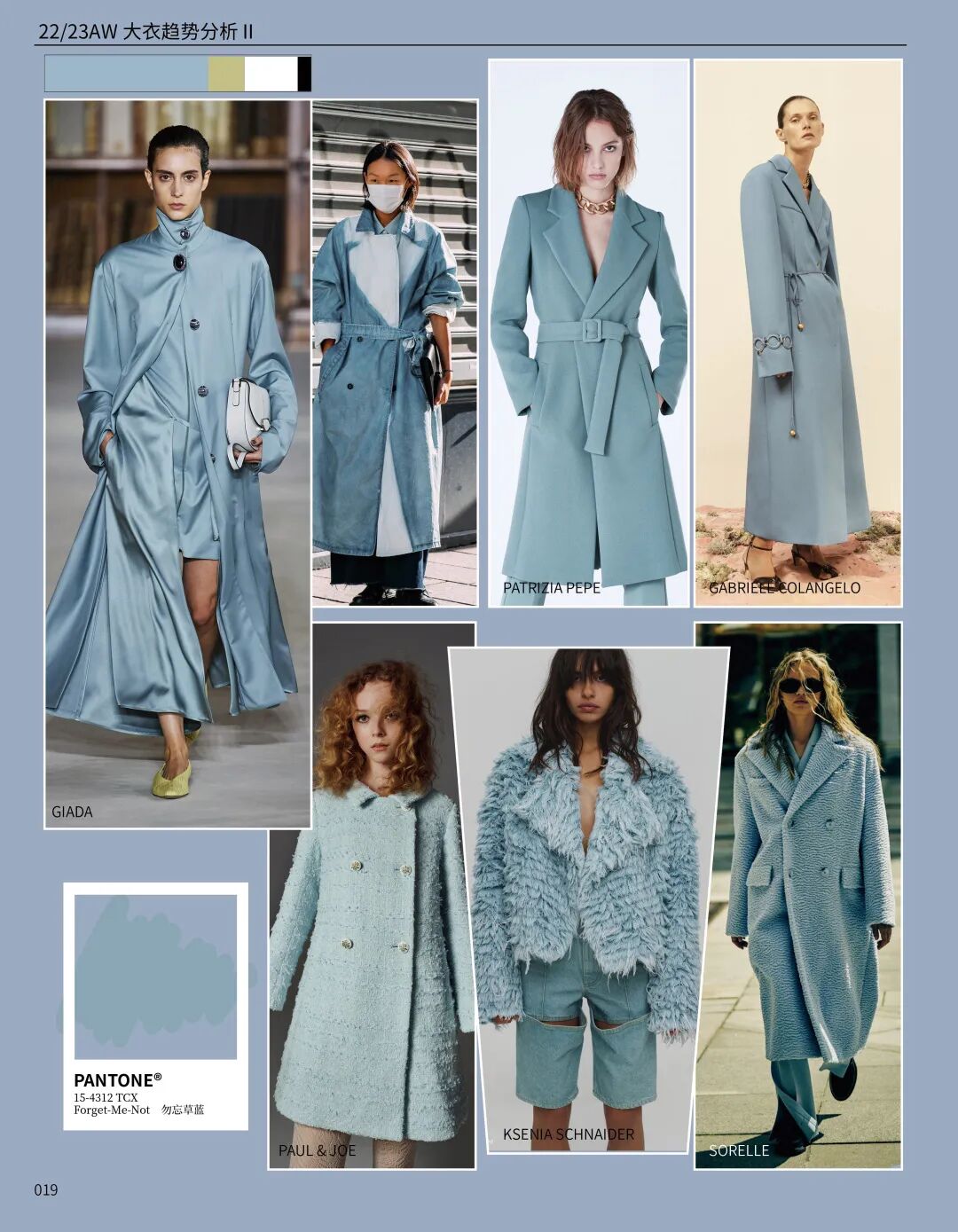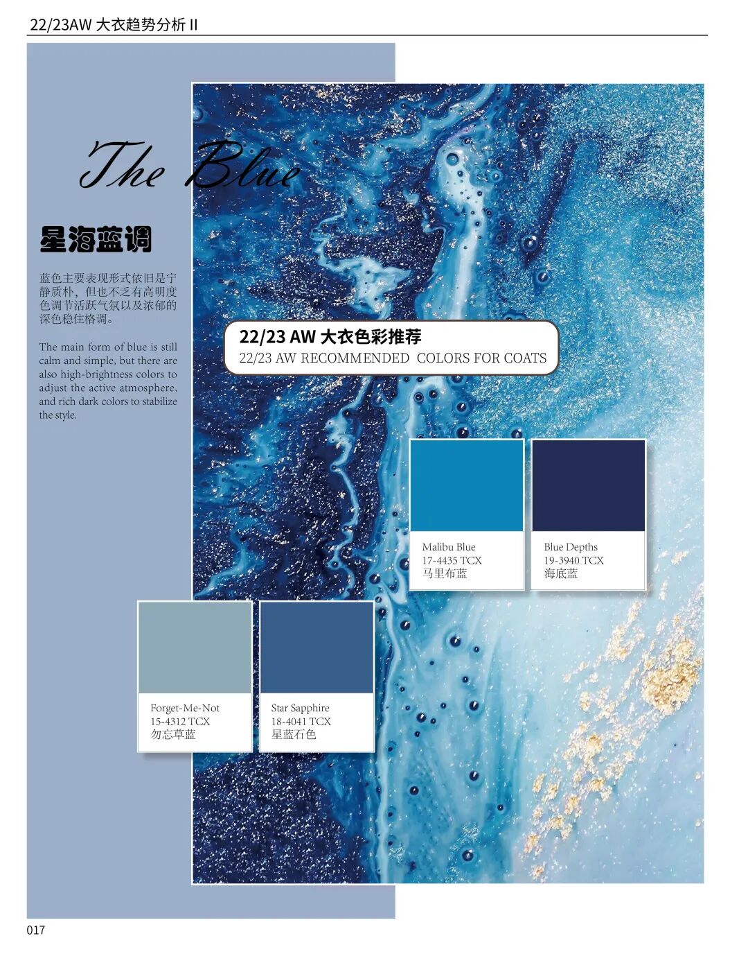 蓝色:蓝色主要表现形式依旧是宁静质朴,但也不乏有高明度色调节活跃气氛以及浓郁的深色稳住格调。