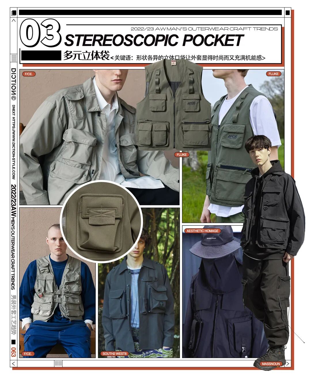 无论山系机能还是时尚潮牌,立体口袋都是一个很重要的设计元素点。立体袋的造型多样,在服装设计中可单袋出现,亦可多袋组合。形状各异的或固定或可拆卸的立体袋让秋冬外套显得个性且时尚。