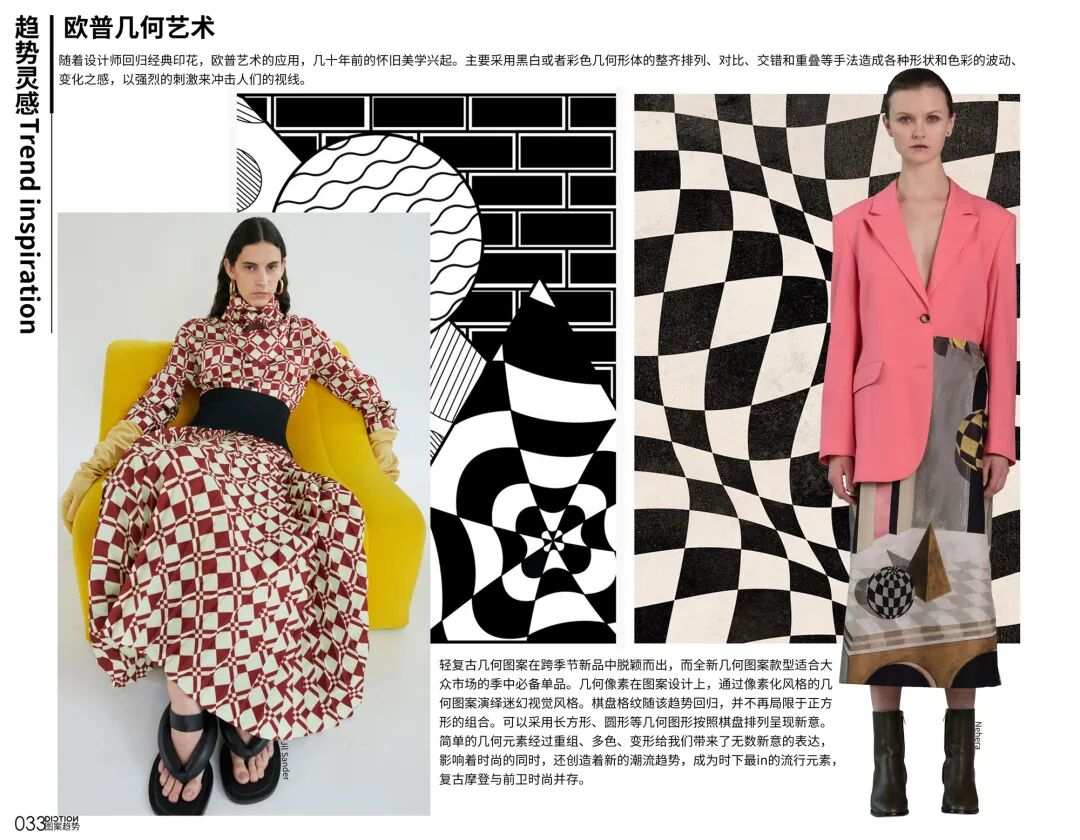 随着设计师回归经典印花,欧普艺术的应用,几十年前的怀旧美学兴起。主要采用黑白或者彩色几何形体的整齐排列、对比、交错和重叠等手法造成各种形状和色彩的波动、变化之感,以强烈的刺激来冲击人们的视线。