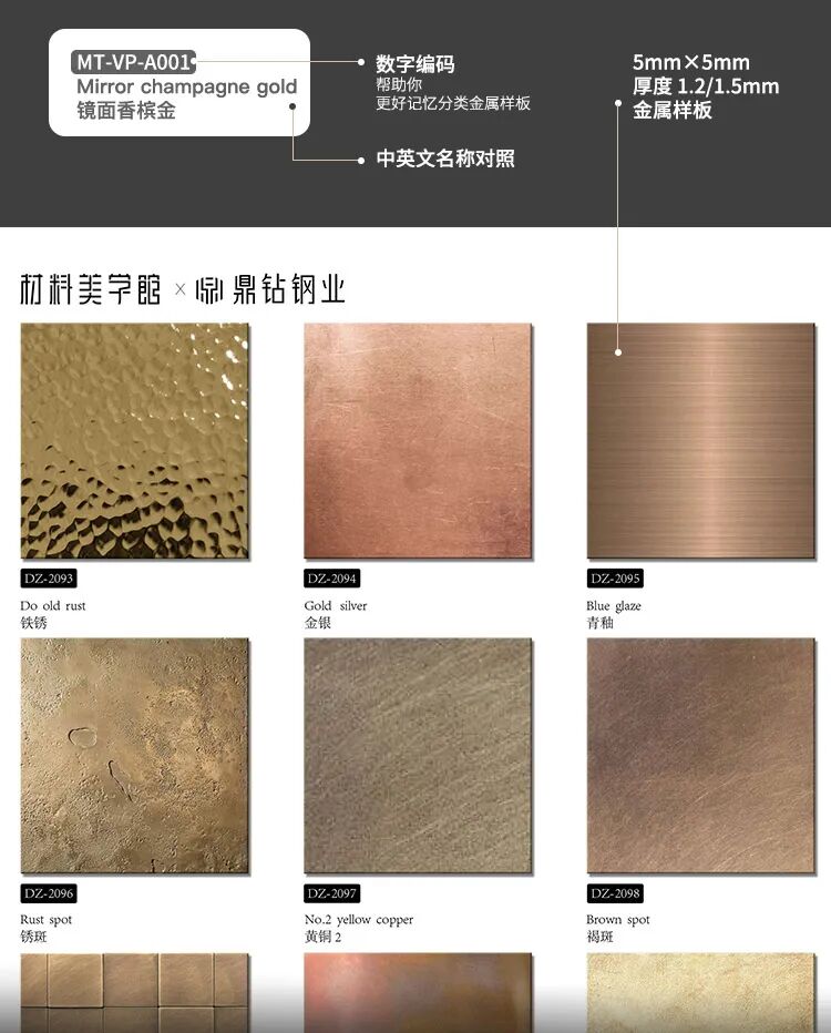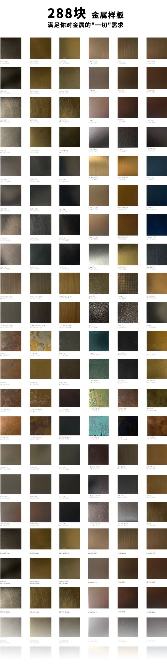 288块不锈钢金属样板,涵盖了14种金属表面处理工艺,24种不同的金属颜色,基本可以满足设计师90%的设计金属材料需求。
