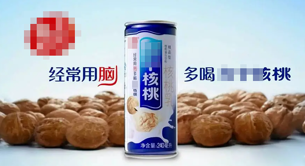 比如这个N个核桃,以前我会单纯的认为这个是牛奶里加入了新鲜核桃生产出来的,毕竟你看这个广告画面啊,这个包装设计啊,上面都是核桃都是奶啊,这肯定是真实的吧?