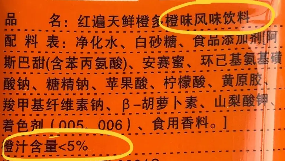 我还看到一个写清楚了的,橙味风味饮料,只是有橙子味,有多少真橙(诚)也告诉你了,小于5%……