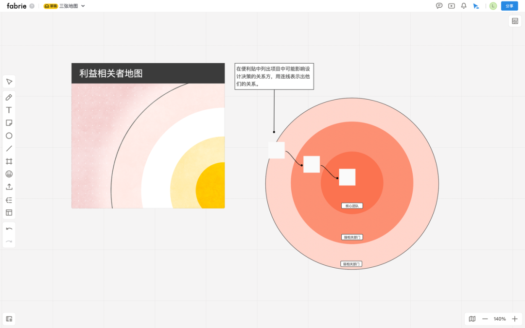 这其实也是为什么要在fabrie中制作利益相关者地图的主要原因。它为设计师提供了一个便于上手和制作的模板,但也可以随时根据自己的需求自由调整,成为一个实现高效的捷径。