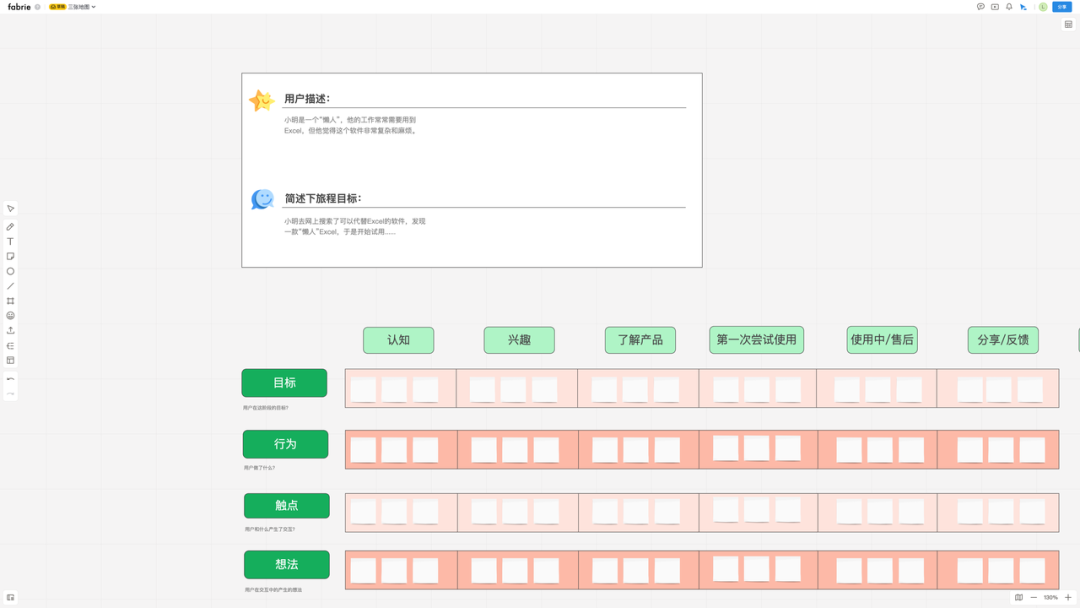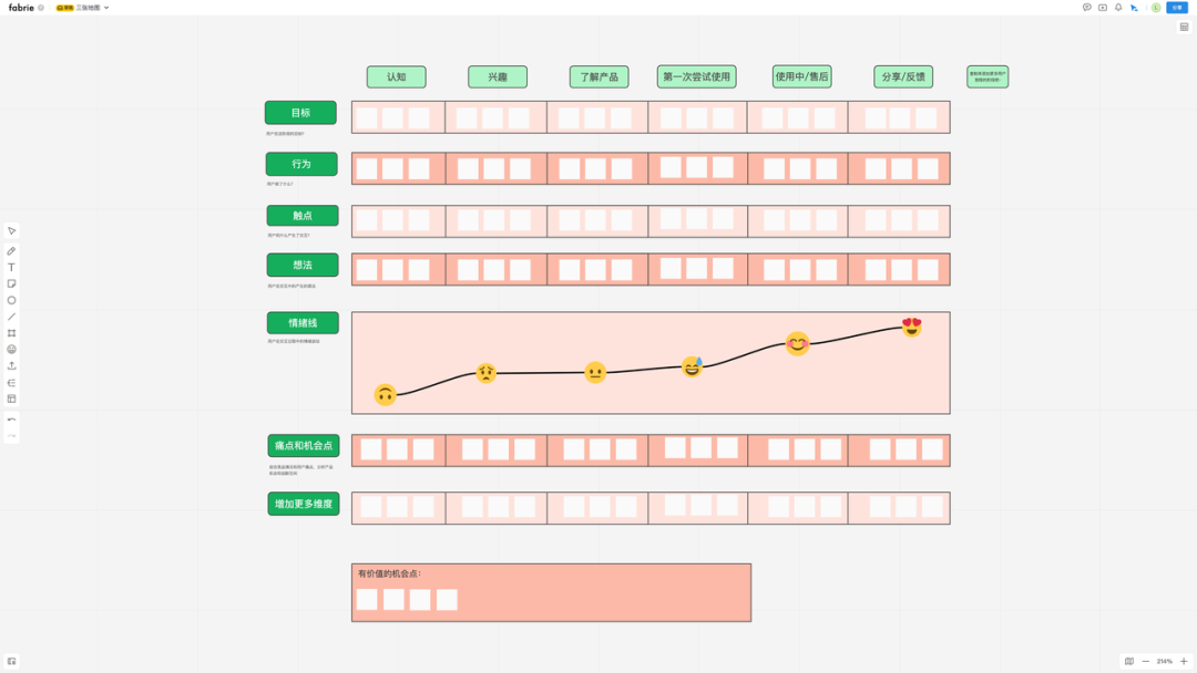 在完成用户旅程阶段后,探索每个阶段用户使用产品时的体验感受,思考对应的目标、行为、触点、想法、情绪、痛点和机会点。
