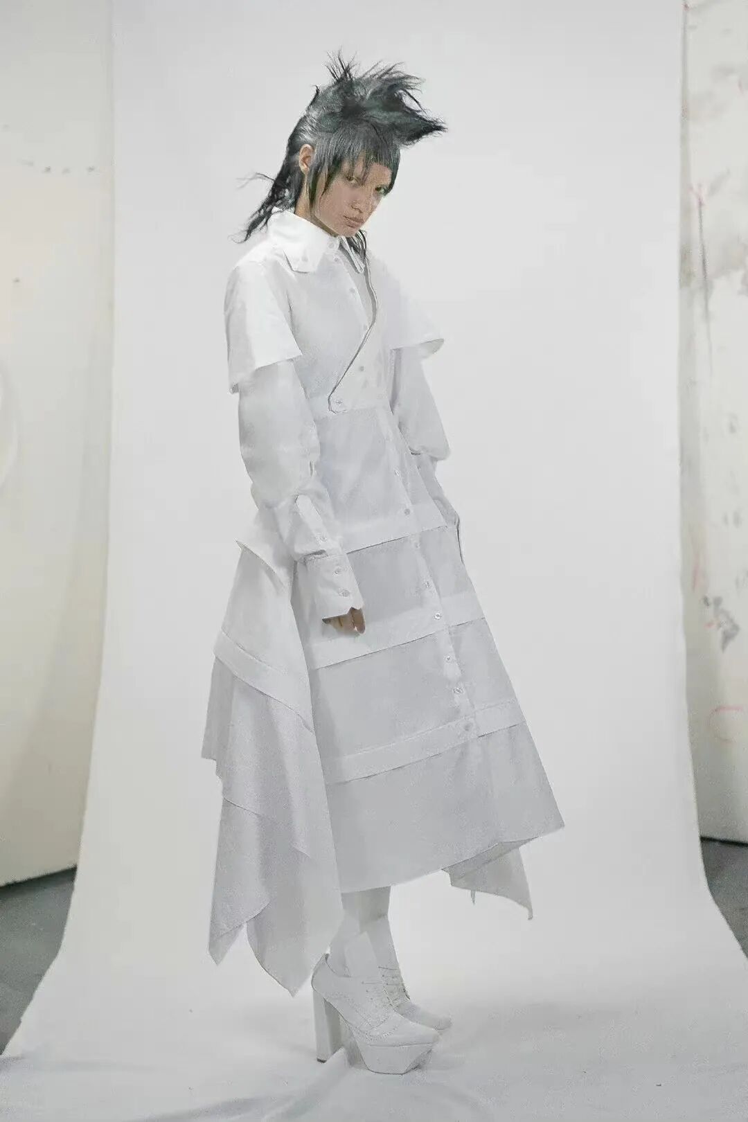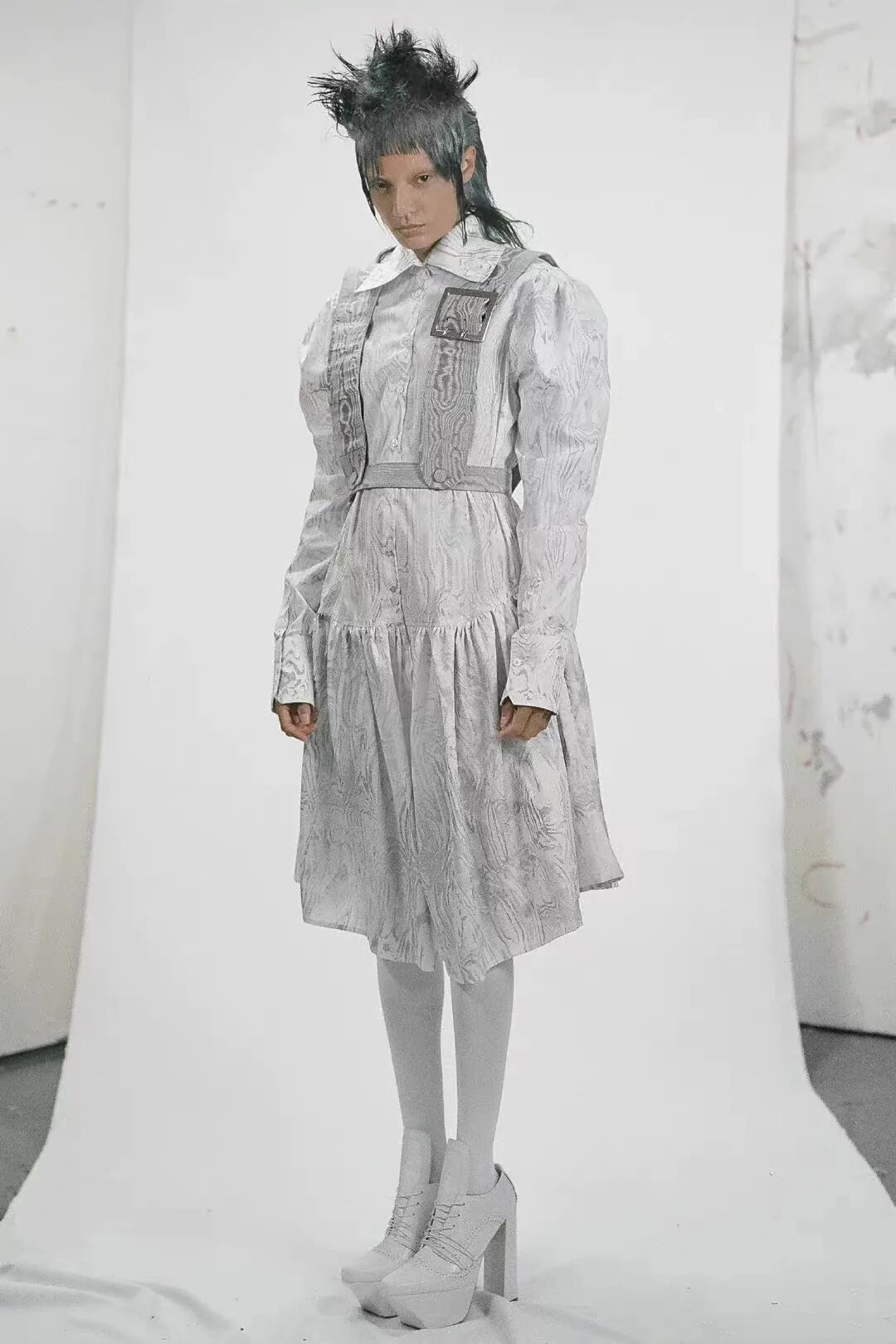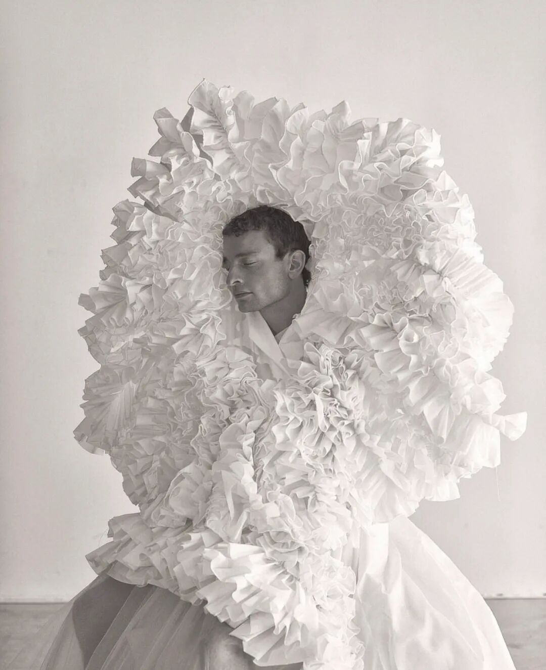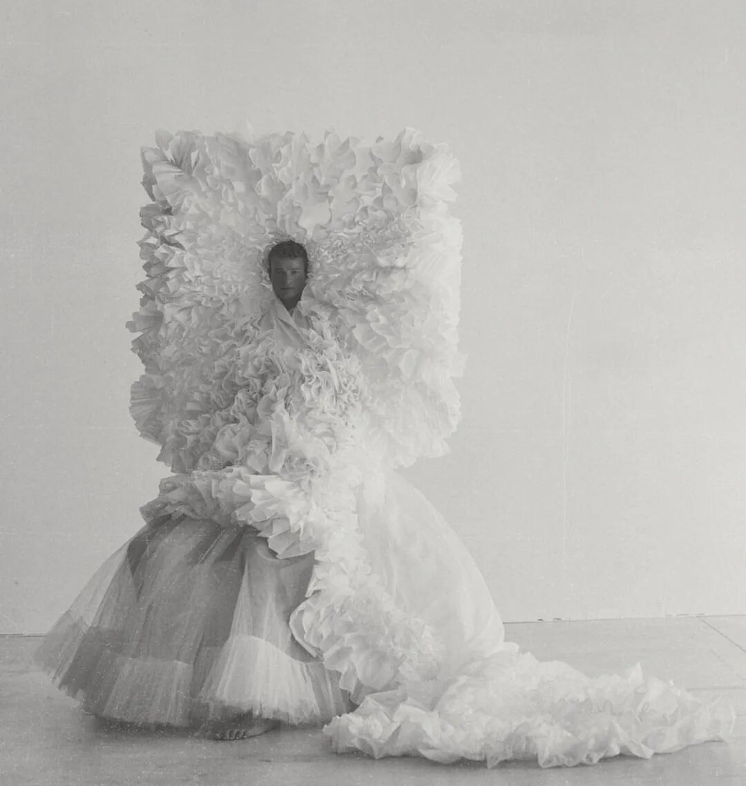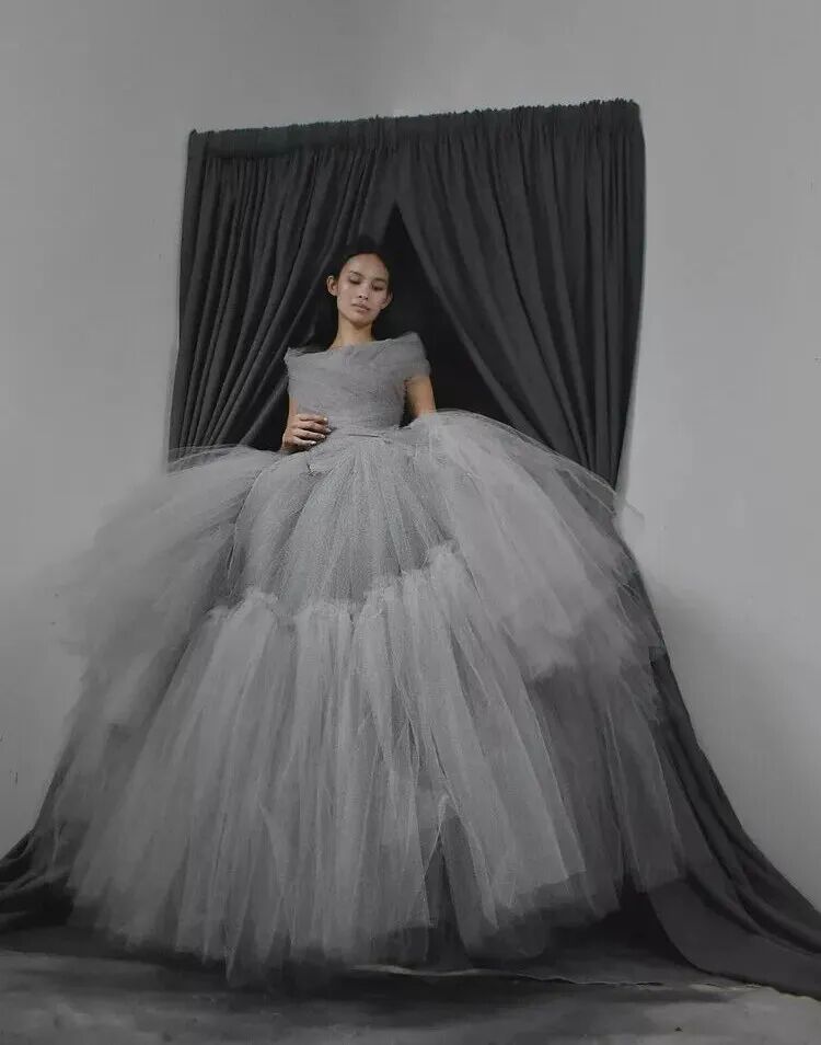 他将自己的文化和极具普通的“窗帘”融为一体,创造出纯白色的浪漫梦境,不规则的褶皱、大小交错的荷叶边,浪漫的蕾丝面料,丰富的垂褶布堆叠出戏剧化的三维效果,在风格上体现出前卫夸张的现代高科技特色。
